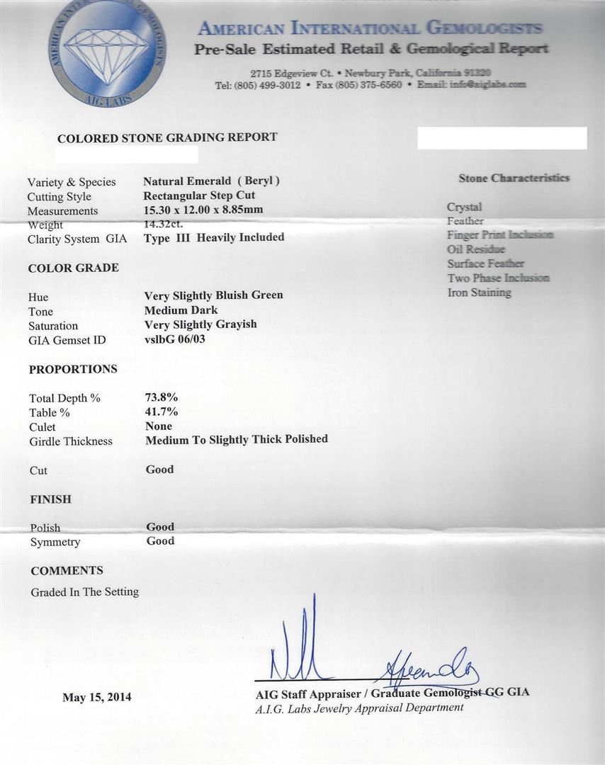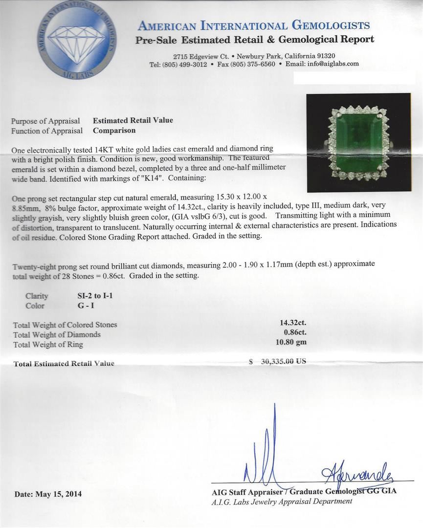 One electronically tested 14KT white gold ladies cast emerald and diamond ring with a bright polish finish. Condition is new, good workmanship. The featured emerald is set within a diamond bezel, completed by a three and one-half millimeter wide band. Identified with markings of "K14". Containing: One prong set rectangular step cut natural emerald, measuring 15.30 x 12.00 x 8.85mm, 8% bulge factor, approximate weight of 14.32ct., clarity is heavily included, type III, medium dark, very slightly grayish, very slightly bluish green color, (GIA vslbG 6/3), cut is good. Transmitting light with a minimum of distortion, transparent to translucent. Naturally occurring internal & external characteristics are present. Indications of oil residue. Graded in the setting. The ring also contains Twenty-eight prong set round brilliant cut diamonds, measuring 2.00 - 1.90 x 1.17mm (depth est.) approximate total weight of 28 Stones = 0.86ct. Graded in the setting. Clarity: SI-2 to I-1. Color: G-I. Total Weight of Colored Stones 14.32ct. Total Weight of Diamonds 0.86ct. Total Weight of Ring: 10.80gm. AIG Appraised at $30,335.00.
