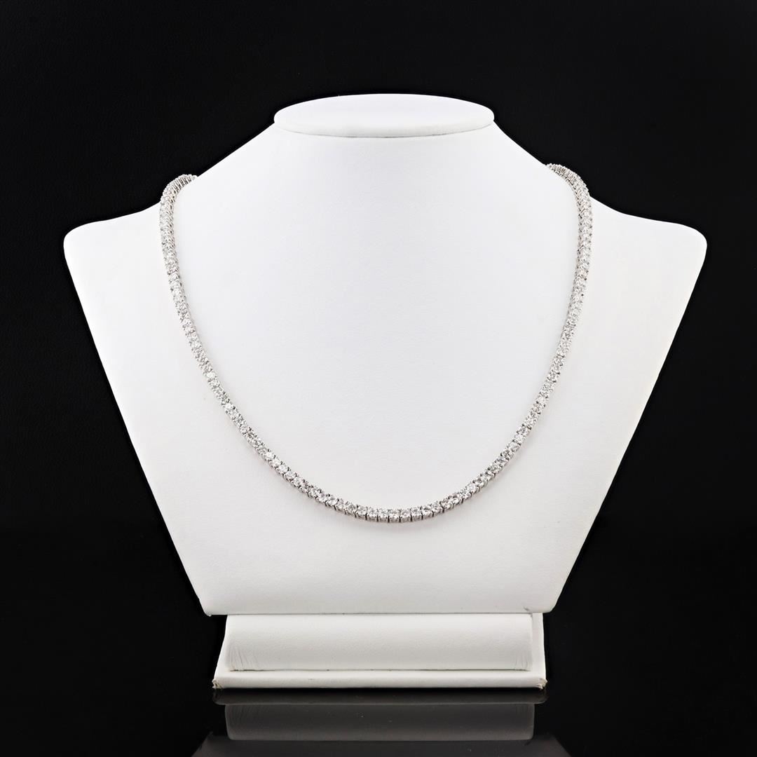 14.33ctw Diamond Platinum Tennis Necklace. One polished, stamped, and tested platinum necklace mounted with 157 genuine round diamonds weighing approximately 14.33 carats. The necklace measures 17.75 inches in length and is finished with a tension lock clasp and double safety clasp. This item weighs 41.6 grams, condition is like new, excellent workmanship. MAIN GEMSTONES Identity: Natural Diamond Shape: Round Cutting Style: Brilliant Cut Quantity: 157 Diamonds Measurements: 2.8 - 3.0mm Total Weight: 14.33 carats Color Grade: G - H Clarity Grade: I1 to I2 Cut Grade: Very Good Refractive Index: 2.418 Specific Gravity: 3.52 +/-0 01 Hardness: 10 TOTAL DIAMOND WEIGHT: 14.33ctw WEIGHT OF ITEM: 41.6 grams METAL: Platinum