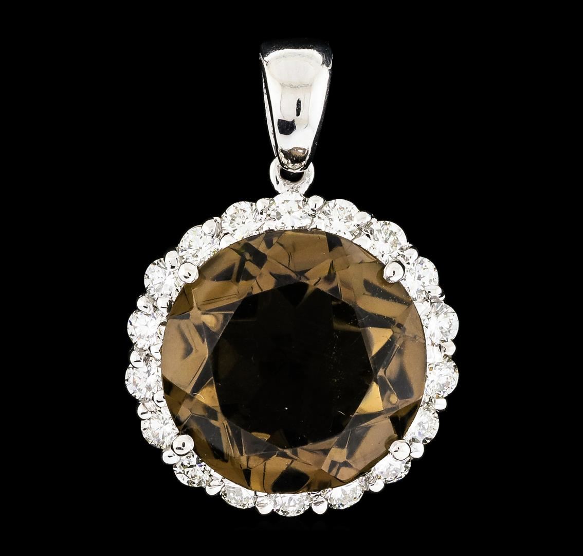 One Topaz and Diamond Pendant featuring: 14KT White Gold with a total weight of 5.25 grams, Topaz with a total weight of 14.34ct, and side diamonds with a total weight of 1.66ctw.