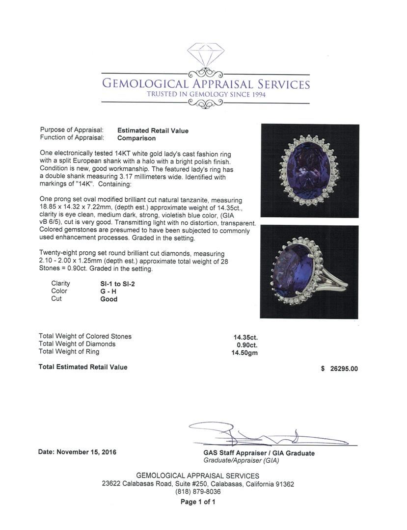 One electronically tested 14KT white gold lady's cast fashion ring with a split European shank with a halo with a bright polish finish. The featured lady's ring has a double shank measuring 3.17 millimeters wide. Identified with markings of '14K'. Condition is new, good workmanship. Containing: One prong set oval modified brilliant cut natural tanzanite, measuring 18.85 x 14.32 x 7.22mm, (depth est.) approximate weight of 14.35ct., clarity is eye clean, medium dark, strong, violetish blue color, (GIA vB 6/5), cut is very good. Transmitting light with no distortion, transparent. Colored gemstones are presumed to have been subjected to commonly used enhancement processes. Graded in the setting. Twenty-Eight prong set round brilliant cut diamonds, measuring 2.10 - 2.00 x 1.25mm (depth est.) approximate total weight of 28 Stones = 0.90ct. Graded in the setting. Clarity SI-1 to SI-2. Color: G - H Cut Good. Total Weight of Colored Stones 14.35ct.. Total Weight of Diamonds 0.90ct.. Total Weight of Ring 14.50gm. GAS Appraised at $26,295.00.