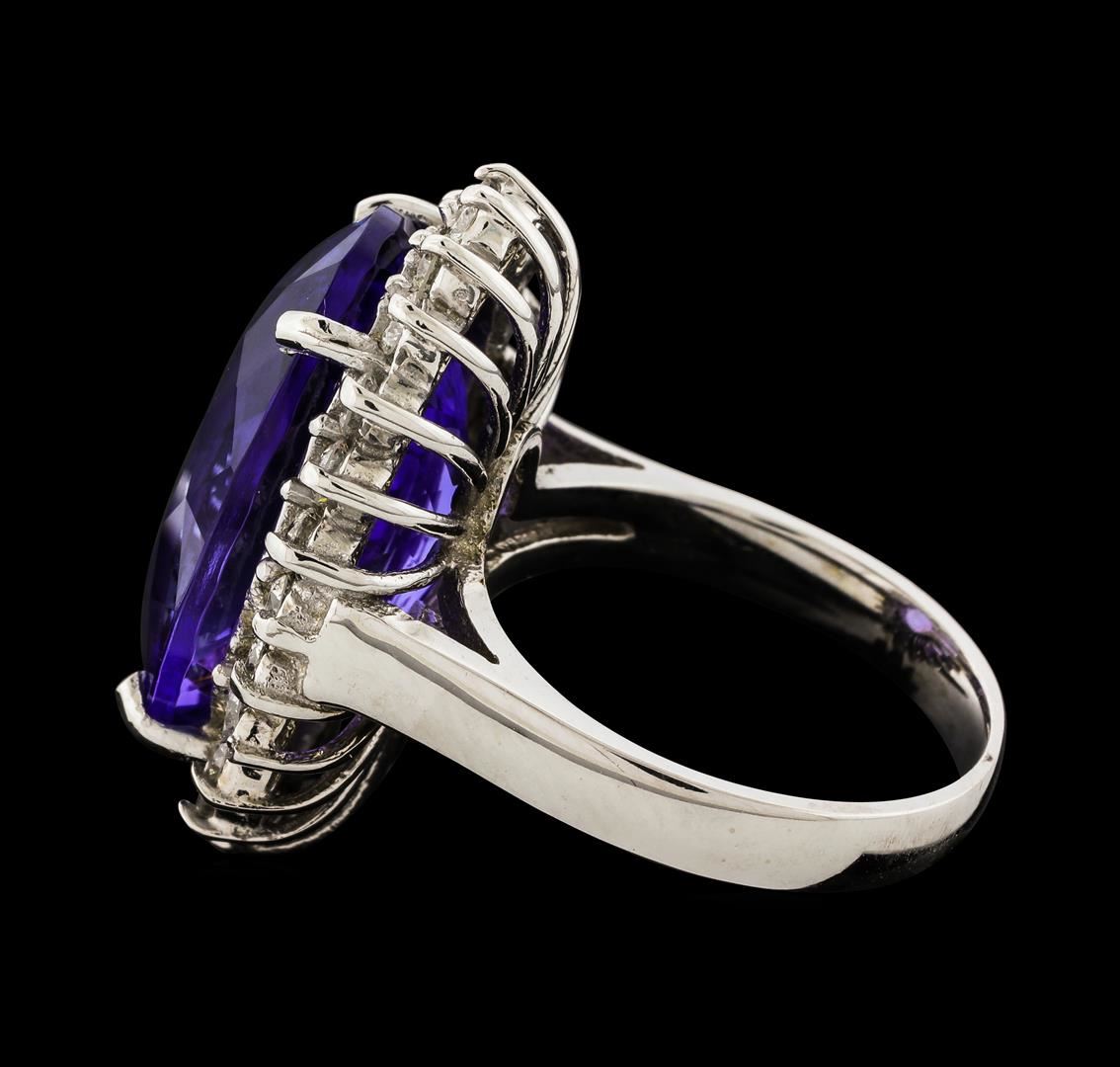 One electronically tested 14KT white gold lady's cast fashion ring with a basket halo with a bright polish finish. The featured lady's ring has a shank measuring 2.82 millimeters wide. Identified with markings of '14K'. Condition is new, good workmanship. Containing: One prong set oval modified brilliant cut natural tanzanite, measuring 18.40 x 13.32 x 8.23mm, (depth est.) approximate weight of 14.43ct., clarity is eye clean, medium, moderately strong, violetish blue color, (GIA vB 5/4), cut is very good. Transmitting light with no distortion, transparent. Colored gemstones are presumed to have been subjected to commonly used enhancement processes. Graded in the setting. Twenty-Four prong set round brilliant cut diamonds, measuring 2.20 - 2.10 x 1.33mm (depth est.) approximate total weight of 24 Stones = 0.90ct. Graded in the setting. Clarity SI-1 to SI-2. Color: G - H Cut Good. Total Weight of Colored Stones 14.43ct.. Total Weight of Diamonds 0.90ct.. Total Weight of Ring 9.60gm. GAS Appraised at $23,835.00.