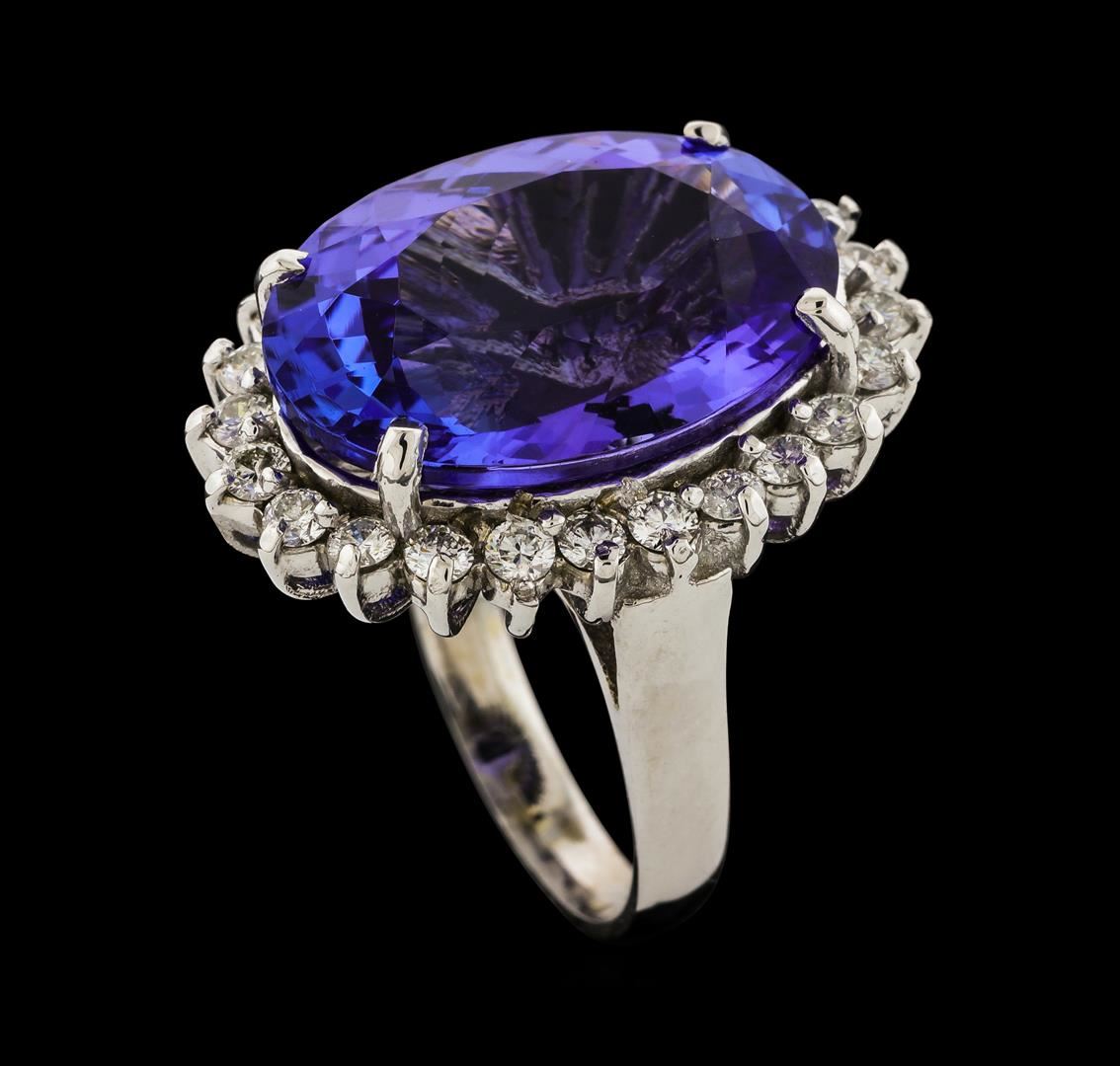 One electronically tested 14KT white gold lady's cast fashion ring with a basket halo with a bright polish finish. The featured lady's ring has a shank measuring 2.82 millimeters wide. Identified with markings of '14K'. Condition is new, good workmanship. Containing: One prong set oval modified brilliant cut natural tanzanite, measuring 18.40 x 13.32 x 8.23mm, (depth est.) approximate weight of 14.43ct., clarity is eye clean, medium, moderately strong, violetish blue color, (GIA vB 5/4), cut is very good. Transmitting light with no distortion, transparent. Colored gemstones are presumed to have been subjected to commonly used enhancement processes. Graded in the setting. Twenty-Four prong set round brilliant cut diamonds, measuring 2.20 - 2.10 x 1.33mm (depth est.) approximate total weight of 24 Stones = 0.90ct. Graded in the setting. Clarity SI-1 to SI-2. Color: G - H Cut Good. Total Weight of Colored Stones 14.43ct.. Total Weight of Diamonds 0.90ct.. Total Weight of Ring 9.60gm. GAS Appraised at $23,835.00.