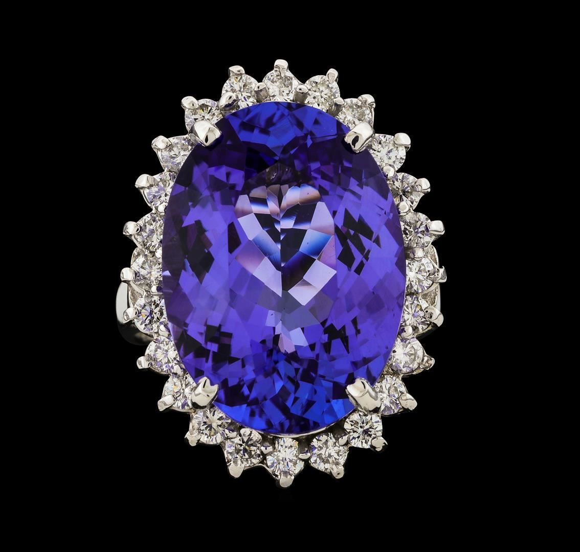 One electronically tested 14KT white gold lady's cast fashion ring with a basket halo with a bright polish finish. The featured lady's ring has a shank measuring 2.82 millimeters wide. Identified with markings of '14K'. Condition is new, good workmanship. Containing: One prong set oval modified brilliant cut natural tanzanite, measuring 18.40 x 13.32 x 8.23mm, (depth est.) approximate weight of 14.43ct., clarity is eye clean, medium, moderately strong, violetish blue color, (GIA vB 5/4), cut is very good. Transmitting light with no distortion, transparent. Colored gemstones are presumed to have been subjected to commonly used enhancement processes. Graded in the setting. Twenty-Four prong set round brilliant cut diamonds, measuring 2.20 - 2.10 x 1.33mm (depth est.) approximate total weight of 24 Stones = 0.90 ct. Graded in the setting. Clarity SI-1 to SI-2. Color: G - H Cut Good. Total Weight of Colored Stones 14.43ct.. Total Weight of Diamonds 0.90 ct.. Total Weight of Ring 9.60gm. GAS Appraised.