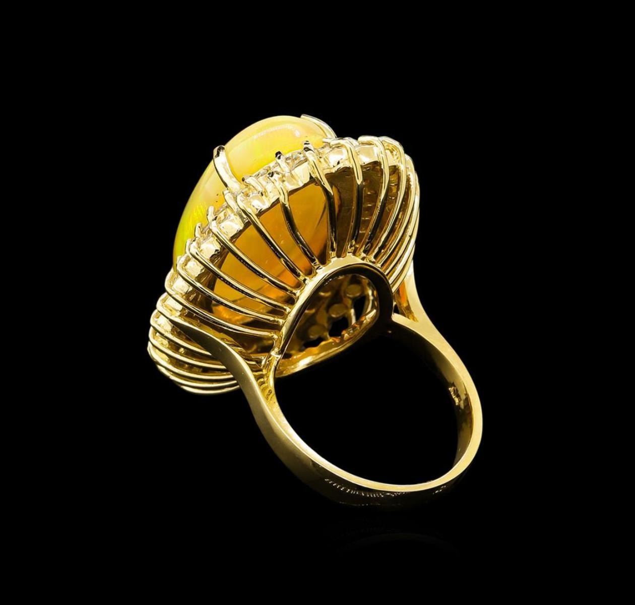 One electronically tested 14KT yellow gold lady's cast fashion ring with a double basket halo with a bright polish finish. The featured lady's ring has shank measuring 3.37 millimeters wide. Identified with markings of "K14". Condition is new, good workmanship. Containing: One semi crystal opal that is cut in a oval shaped cabochon and is prong set, measuring 26.15 mm long x 14.23 mm wide, and 8.66 mm thick and the approximate weight is 14.56 carats. The opal has a quite bright, green-orange play of color (fire) in a rolling flashfire pattern; a medium dome; a good cut; no inclusions; consistent in its brightness and pattern; and is not directional. Graded in the setting. Thirty prong set round brilliant cut diamonds, measuring 2.60 - 2.50 x 1.58mm (depth est.) approximate total weight of 30 Stones = 1.90ct. Graded in the setting. Clarity: SI-1 to SI-2. Color: H - I. Cut Good Thirty prong set round brilliant cut diamonds, measuring 2.30 - 2.20 x 1.35mm (depth est.) approximate total weight of 30 Stones = 1.25ct. Graded in the setting. Clarity: SI-1 to SI-2. Color: H - I. Cut Good. Total Weight of Diamonds 3.15ct. Total Weight of Opals 14.56ct. Total Weight of Ring 19.00gm. GAS Appraised.