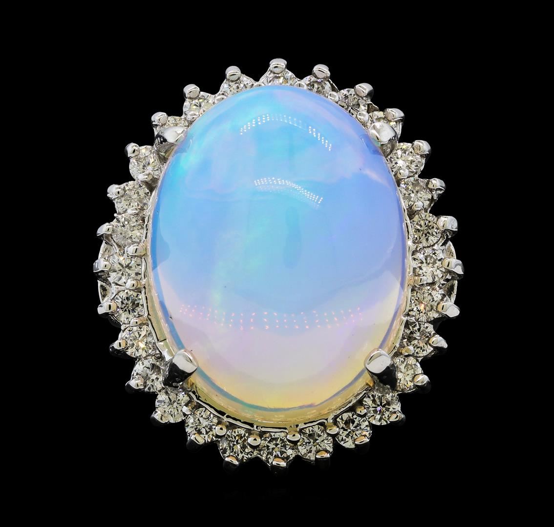 One electronically tested 14KT white gold lady's cast fashion ring with a basket halo with a bright polish finish. The featured lady's ring has a shank measuring 3.39 millimeters wide. Identified with markings of '14K'. Condition is new, good workmanship. Containing: One crystal opal that is cut in a oval shaped cabochon and is prong set, measuring 18.97 mm long x 14.72 mm wide, and 11.20 mm thick and the approximate weight is 14.58 carats. The opal has a quite bright, blue-green play of color (fire) in a rolling flashfire pattern; a high dome; a good cut; no inclusions; consistent in its brightness and pattern; and is slightly directional. Graded in the setting. Twenty-Eight prong set round brilliant cut diamonds, measuring 2.10 - 2.00 x 1.23mm (depth est.) approximate total weight of 28 Stones = 0.88ct. Graded in the setting. Clarity SI-1 to SI-2. Color: G - H Cut Good. Total Weight of Diamonds 0.88ct.. Total Weight of Opals 14.58ct.. Total Weight of Ring 12.10gm. GAS Appraised at $8,940.00.