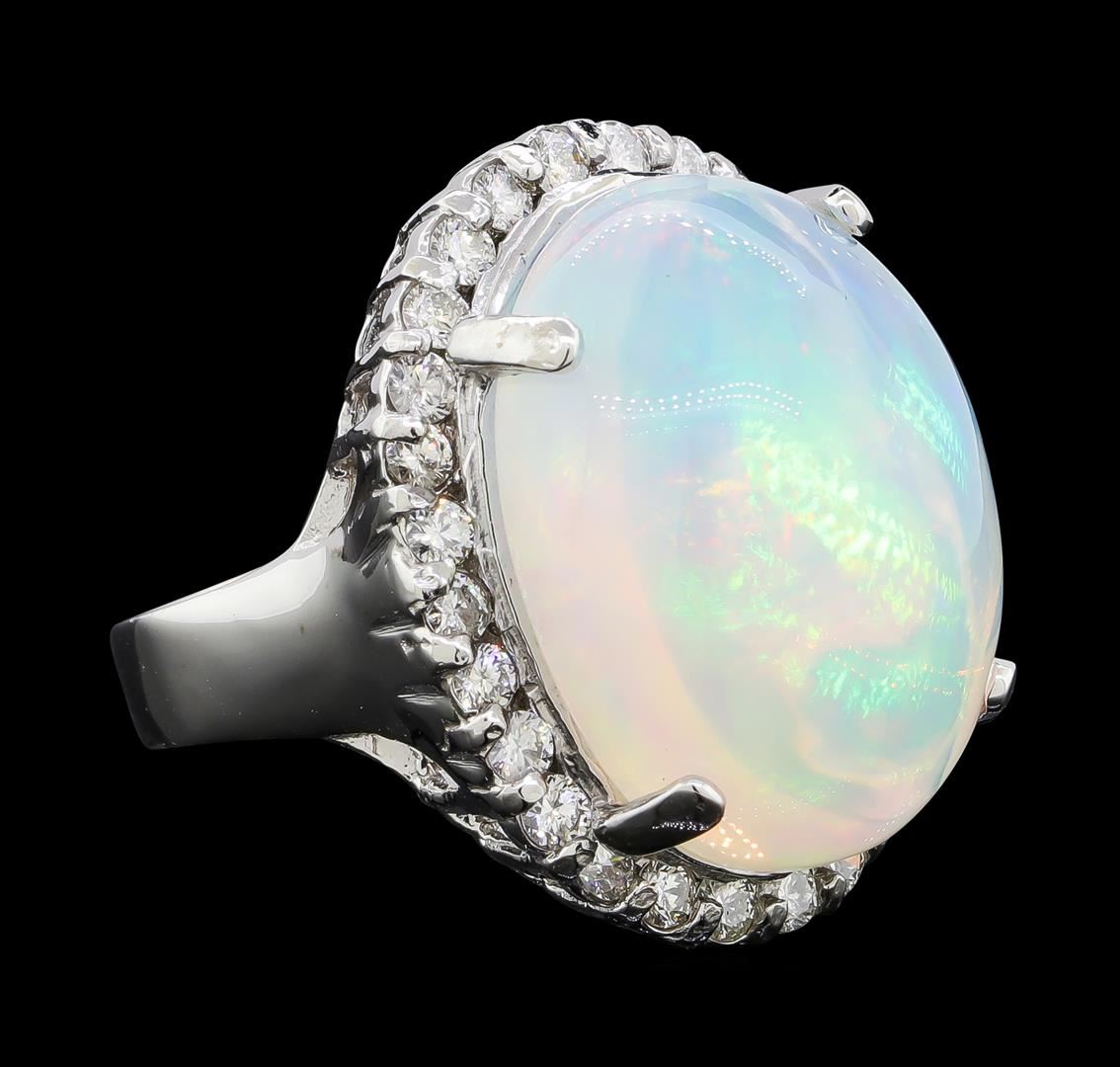 One electronically tested 14KT white gold lady's cast fashion ring with a basket halo with a bright polish finish. The featured lady's ring has a shank measuring 3.44 millimeters wide. Identified with markings of '14K'. Condition is new, good workmanship. Containing: One crystal opal that is cut in a oval shaped cabochon and is prong set, measuring 19.80 mm long x 15.98 mm wide, and 10.30 mm thick and the approximate weight is 14.60 carats. The opal has a bright, red multicolor play of color (fire) in a rolling flashfire pattern; a high dome; a good cut; no inclusions; consistent in its brightness and pattern; and is not directional. Graded in the setting. Twenty-Eight prong set round brilliant cut diamonds, measuring 2.10 - 2.00 x 1.25mm (depth est.) approximate total weight of 28 Stones = 0.90ct. Graded in the setting. Clarity SI-1 to I-1. Color: G - H Cut Good. Total Weight of Diamonds 0.90ct.. Total Weight of Opals 14.60ct.. Total Weight of Ring 9.50gm. GAS Appraised at $9,905.00.