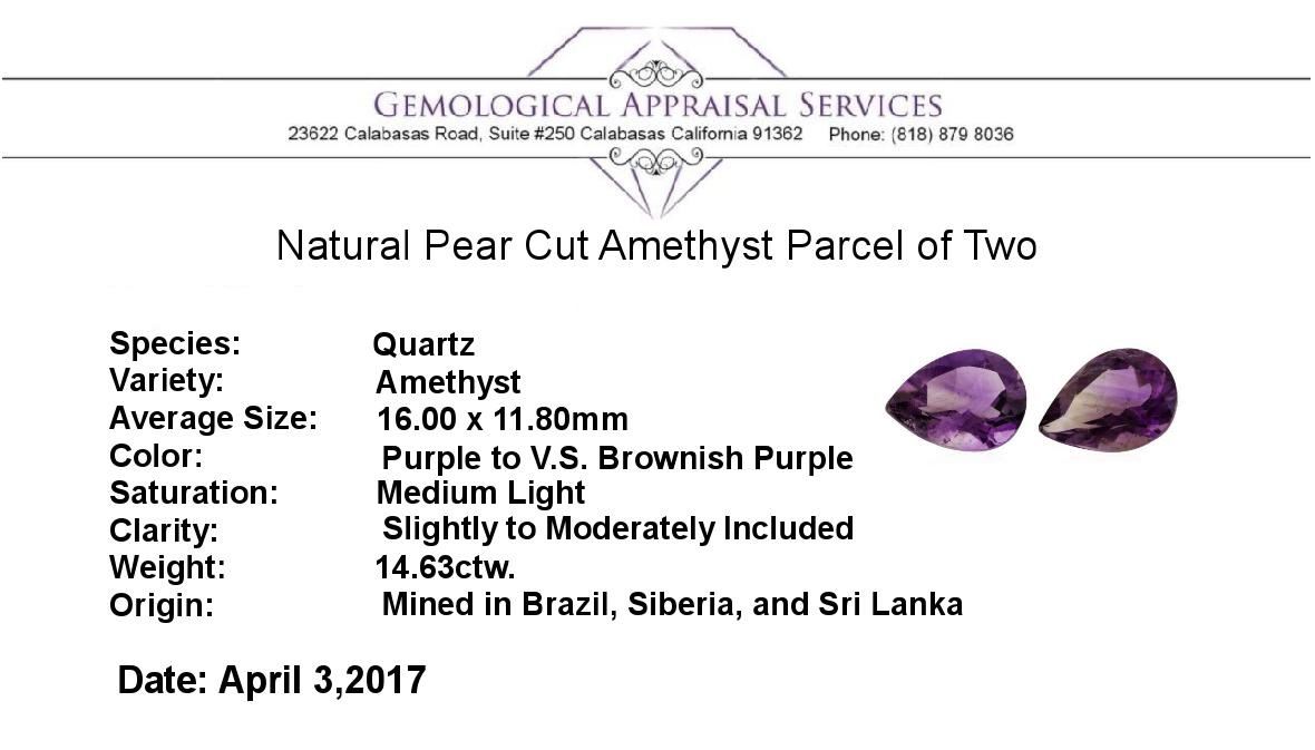 One natural pear cut amethyst parcel of two with an exact weight of 14.63ctw., clarity is slightly to moderately included, purple to v.s. brownish purple, medium light. Gemological Appraisals Services estimates the retail value at $365.75 GAS Appraised.