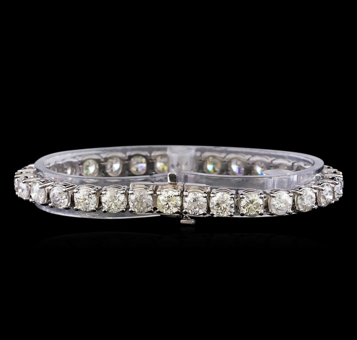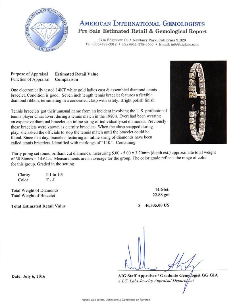One electronically tested 14KT white gold ladies cast & assembled diamond tennis bracelet. Seven inch length tennis bracelet features a flexible diamond ribbon, terminating in a concealed clasp with safety. Bright polish finish. Tennis bracelets got their unusual name from an incident involving the U.S. professional tennis player Chris Evert during a tennis match in the 1980's. Evert had been wearing an expensive diamond bracelet, an inline string of individually-set diamonds. Previously these bracelets were known as eternity bracelets. When the clasp snapped during play, she asked the officials to stop the tennis match until the bracelet could be found. Since that day, bracelets featuring an inline string of diamonds have been called tennis bracelets. Identified with markings of "14K". Condition is good. Containing: Thirty prong set round brilliant cut diamonds, measuring 5.00 - 5.00 x 3.20mm (depth est.) approximate total weight of 30 Stones = 14.64ct. Measurements are an average for the group. The color grade reflects the range of color for this group. Graded in the setting. Clarity: I-1 to I-3. Color: F - J. Total Weight of Diamonds 14.64ct. Total Weight of Bracelet 22.88gm. AIG Appraised at $46,335.00.