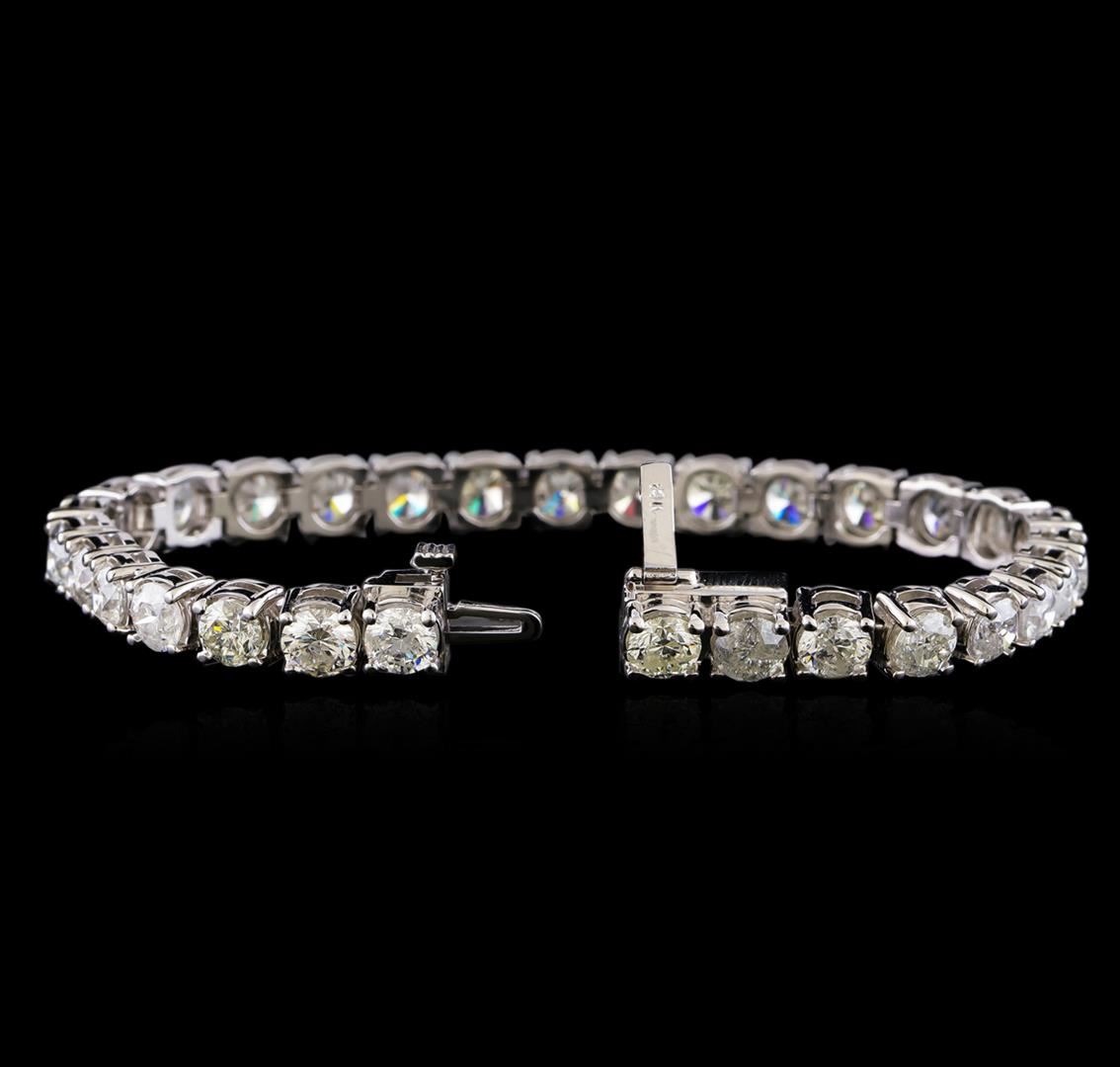 One electronically tested 14KT white gold ladies cast & assembled diamond tennis bracelet. Seven inch length tennis bracelet features a flexible diamond ribbon, terminating in a concealed clasp with safety. Bright polish finish. Tennis bracelets got their unusual name from an incident involving the U.S. professional tennis player Chris Evert during a tennis match in the 1980's. Evert had been wearing an expensive diamond bracelet, an inline string of individually-set diamonds. Previously these bracelets were known as eternity bracelets. When the clasp snapped during play, she asked the officials to stop the tennis match until the bracelet could be found. Since that day, bracelets featuring an inline string of diamonds have been called tennis bracelets. Identified with markings of "14K". Condition is good. Containing: Thirty prong set round brilliant cut diamonds, measuring 5.00 - 5.00 x 3.20mm (depth est.) approximate total weight of 30 Stones = 14.64ct. Measurements are an average for the group. The color grade reflects the range of color for this group. Graded in the setting. Clarity: I-1 to I-3. Color: F - J. Total Weight of Diamonds 14.64ct. Total Weight of Bracelet 22.88gm. AIG Appraised at $46,335.00.