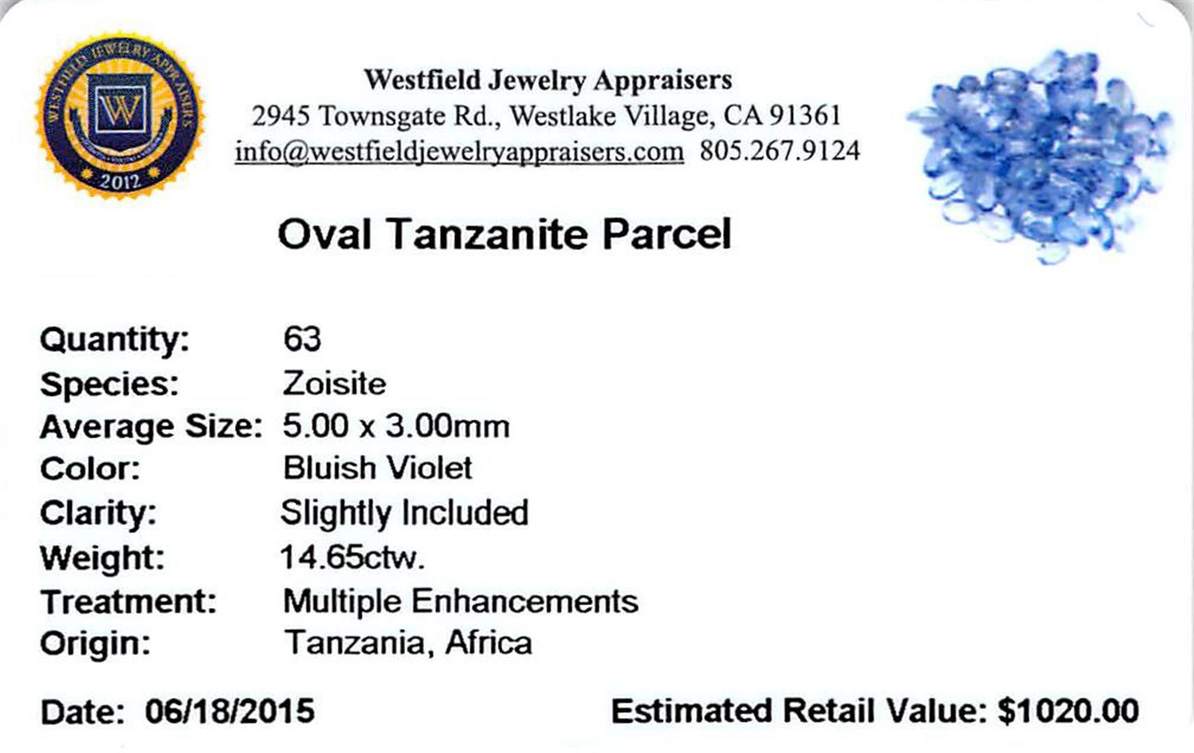 Sixty-three oval mixed cut natural tanzanites, measuring 5.00 x 3.00 x 1.95mm, exact total weight 14.65ct., clarity is slightly included, type I, medium, very slightly grayish, bluish violet color, (GIA bV 5/3), cut is good. Transmitting light with a minimum of distortion, transparent. Naturally occurring internal & external characteristics are present. Measurements & the color grade are an average for the group. Tanzanite is a very rare gemstone that is only found in the country of Tanzania. Originally discovered in 1967. Tiffany & Company, named the stone Tanzanite. It is found in the Usumburu Mountains that border the Umba Valley of northern Tanzania. Tanzanite occurs in gray, brown, violet, blue, reddish-purple, & green. The gem is interesting because of its exceptional pleochroism. Rotated in different directions a tanzanite will exhibit multiple changes of color. Tanzanite has a low tolerance to ultrasonic cleaning, and should not be cleaned using this method. Westfield Appraised at $1,410.00.