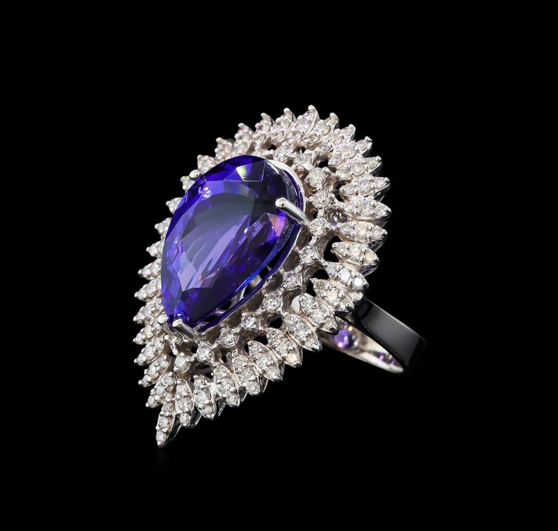 One electronically tested 14KT white gold lady's cast cocktail ring with a triple basket halo with a bright polish finish. The featured lady's ring has a shank measuring 3.43 millimeters wide. Identified with markings of 'K14'. Condition is new, good workmanship. Containing: One prong set pear modified brilliant cut natural tanzanite, measuring 18.49 x 12.68 x 9.29mm, (depth est.) approximate weight of 14.21ct., clarity is eye clean, medium dark, moderately strong, bluish violet color, (GIA bV 6/4), cut is very good. Transmitting light with no distortion, transparent. Colored gemstones are presumed to have been subjected to commonly used enhancement processes. Graded loose prior to setting in the GIA Laboratory, Report #5171668317. Twenty-One prong set round brilliant cut diamonds, measuring 1.90 - 1.80 x 1.15mm (depth est.) approximate total weight of 21 Stones = 0.51ct. Graded in the setting. Clarity SI-1 to I-1. Color: H - I Cut Good Thirty-Six prong set round brilliant cut diamonds, measuring 1.60 - 1.50 x 0.96mm (depth est.) approximate total weight of 36 Stones = 0.51ct. Graded in the setting. Clarity SI-1 to I-1. Color: H - I Cut Good Seventy-Two prong set round brilliant cut diamonds, measuring 1.40 - 1.35 x 0.86mm (depth est.) approximate total weight of 72 Stones = 0.72ct. Graded in the setting. Clarity SI-1 to I-1. Color: H - I Cut Good. Total Weight of Colored Stones 14.21ct.. Total Weight of Diamonds 1.74ct.. Total Weight of Ring 14.60gm GAS Appraised at $27,140.00.