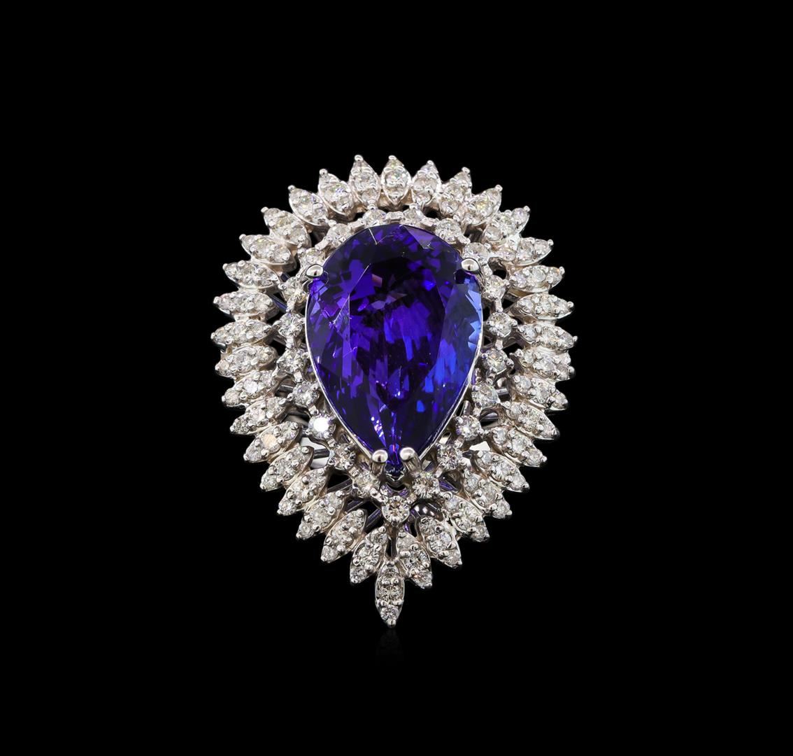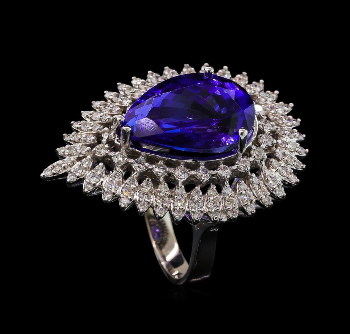 One electronically tested 14KT white gold lady's cast cocktail ring with a triple basket halo with a bright polish finish. The featured lady's ring has a shank measuring 3.43 millimeters wide. Identified with markings of 'K14'. Condition is new, good workmanship. Containing: One prong set pear modified brilliant cut natural tanzanite, measuring 18.49 x 12.68 x 9.29mm, (depth est.) approximate weight of 14.21ct., clarity is eye clean, medium dark, moderately strong, bluish violet color, (GIA bV 6/4), cut is very good. Transmitting light with no distortion, transparent. Colored gemstones are presumed to have been subjected to commonly used enhancement processes. Graded loose prior to setting in the GIA Laboratory, Report #5171668317. Twenty-One prong set round brilliant cut diamonds, measuring 1.90 - 1.80 x 1.15mm (depth est.) approximate total weight of 21 Stones = 0.51ct. Graded in the setting. Clarity SI-1 to I-1. Color: H - I Cut Good Thirty-Six prong set round brilliant cut diamonds, measuring 1.60 - 1.50 x 0.96mm (depth est.) approximate total weight of 36 Stones = 0.51ct. Graded in the setting. Clarity SI-1 to I-1. Color: H - I Cut Good Seventy-Two prong set round brilliant cut diamonds, measuring 1.40 - 1.35 x 0.86mm (depth est.) approximate total weight of 72 Stones = 0.72ct. Graded in the setting. Clarity SI-1 to I-1. Color: H - I Cut Good. Total Weight of Colored Stones 14.21ct.. Total Weight of Diamonds 1.74ct.. Total Weight of Ring 14.60gm GAS Appraised at $27,140.00.