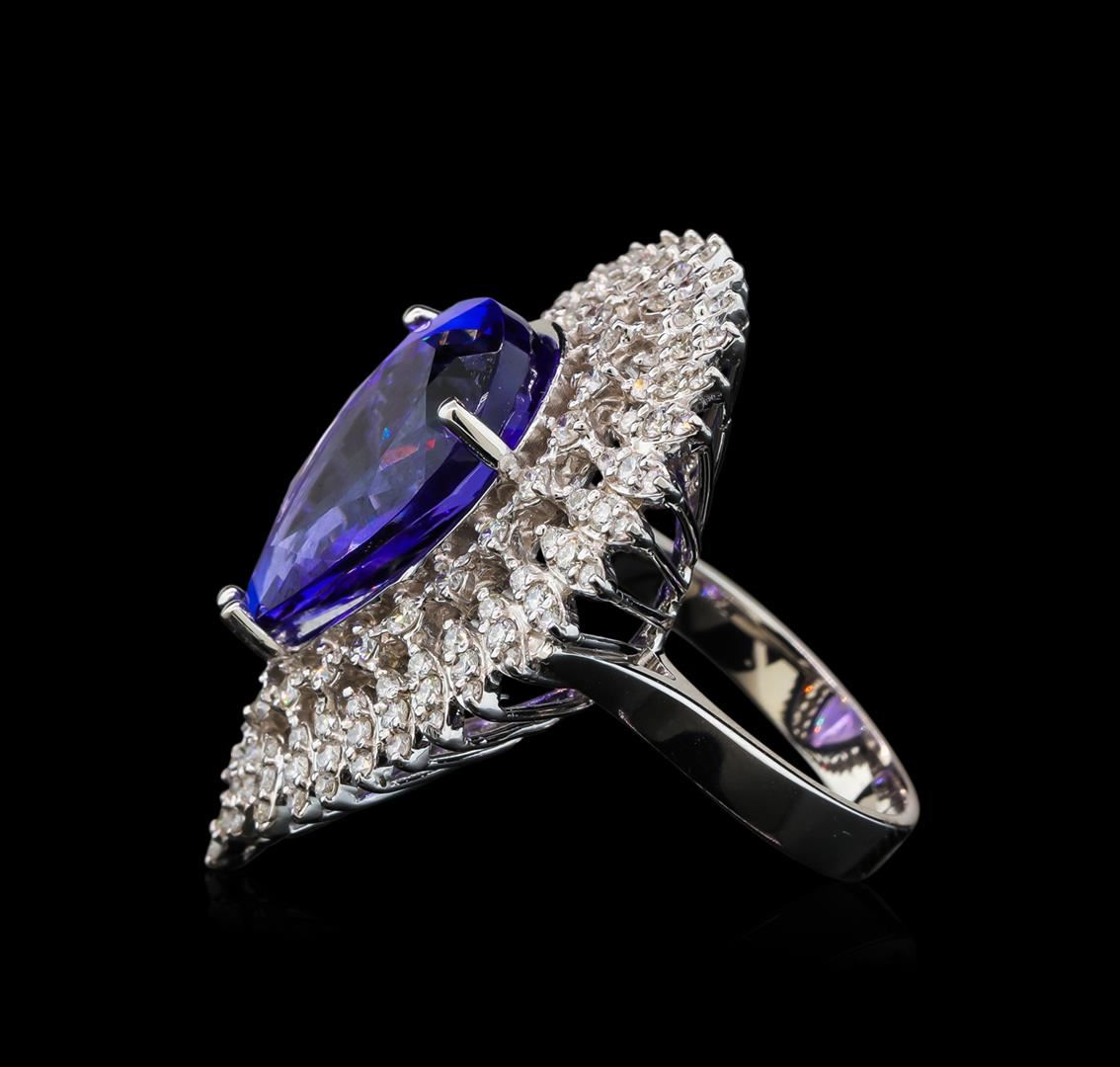 One electronically tested 14KT white gold lady's cast cocktail ring with a triple basket halo with a bright polish finish. The featured lady's ring has a shank measuring 3.43 millimeters wide. Identified with markings of 'K14'. Condition is new, good workmanship. Containing: One prong set pear modified brilliant cut natural tanzanite, measuring 18.49 x 12.68 x 9.29mm, (depth est.) approximate weight of 14.21ct., clarity is eye clean, medium dark, moderately strong, bluish violet color, (GIA bV 6/4), cut is very good. Transmitting light with no distortion, transparent. Colored gemstones are presumed to have been subjected to commonly used enhancement processes. Graded loose prior to setting in the GIA Laboratory, Report #5171668317. Twenty-One prong set round brilliant cut diamonds, measuring 1.90 - 1.80 x 1.15mm (depth est.) approximate total weight of 21 Stones = 0.51ct. Graded in the setting. Clarity SI-1 to I-1. Color: H - I Cut Good Thirty-Six prong set round brilliant cut diamonds, measuring 1.60 - 1.50 x 0.96mm (depth est.) approximate total weight of 36 Stones = 0.51ct. Graded in the setting. Clarity SI-1 to I-1. Color: H - I Cut Good Seventy-Two prong set round brilliant cut diamonds, measuring 1.40 - 1.35 x 0.86mm (depth est.) approximate total weight of 72 Stones = 0.72ct. Graded in the setting. Clarity SI-1 to I-1. Color: H - I Cut Good. Total Weight of Colored Stones 14.21ct.. Total Weight of Diamonds 1.74ct.. Total Weight of Ring 14.60gm GAS Appraised at $27,140.00.