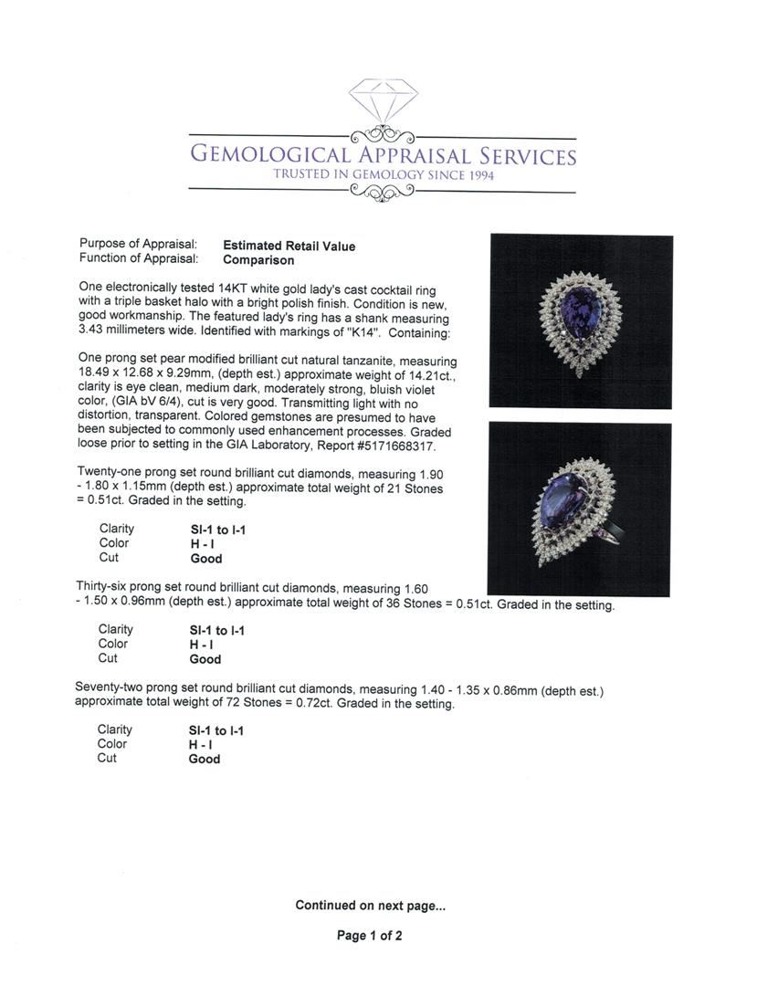One electronically tested 14KT white gold lady's cast cocktail ring with a triple basket halo with a bright polish finish. The featured lady's ring has a shank measuring 3.43 millimeters wide. Identified with markings of 'K14'. Condition is new, good workmanship. Containing: One prong set pear modified brilliant cut natural tanzanite, measuring 18.49 x 12.68 x 9.29mm, (depth est.) approximate weight of 14.21ct., clarity is eye clean, medium dark, moderately strong, bluish violet color, (GIA bV 6/4), cut is very good. Transmitting light with no distortion, transparent. Colored gemstones are presumed to have been subjected to commonly used enhancement processes. Graded loose prior to setting in the GIA Laboratory, Report #5171668317. Twenty-One prong set round brilliant cut diamonds, measuring 1.90 - 1.80 x 1.15mm (depth est.) approximate total weight of 21 Stones = 0.51ct. Graded in the setting. Clarity SI-1 to I-1. Color: H - I Cut Good Thirty-Six prong set round brilliant cut diamonds, measuring 1.60 - 1.50 x 0.96mm (depth est.) approximate total weight of 36 Stones = 0.51ct. Graded in the setting. Clarity SI-1 to I-1. Color: H - I Cut Good Seventy-Two prong set round brilliant cut diamonds, measuring 1.40 - 1.35 x 0.86mm (depth est.) approximate total weight of 72 Stones = 0.72ct. Graded in the setting. Clarity SI-1 to I-1. Color: H - I Cut Good. Total Weight of Colored Stones 14.21ct.. Total Weight of Diamonds 1.74ct.. Total Weight of Ring 14.60gm GAS Appraised at $27,140.00.