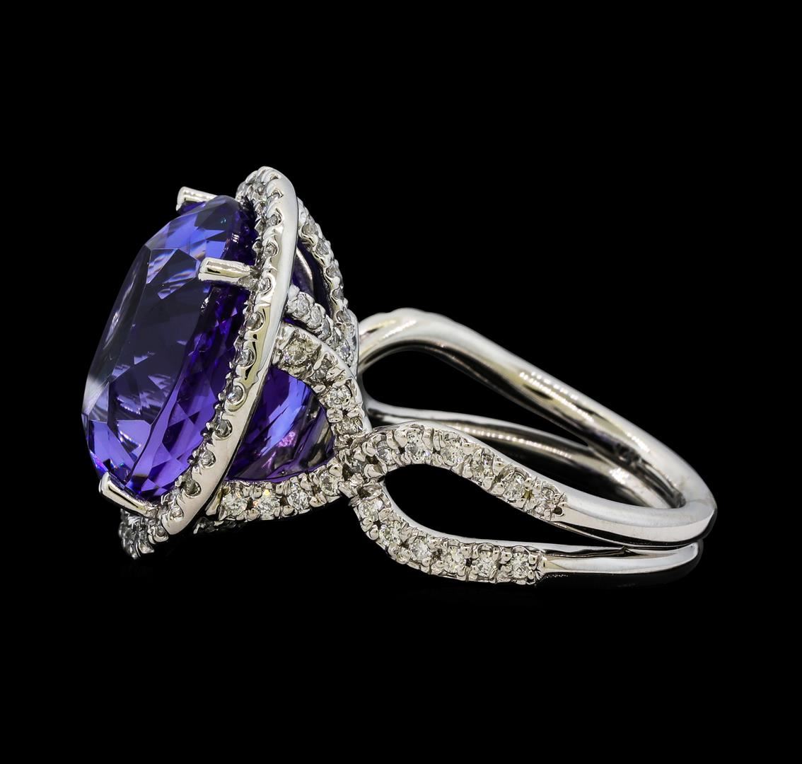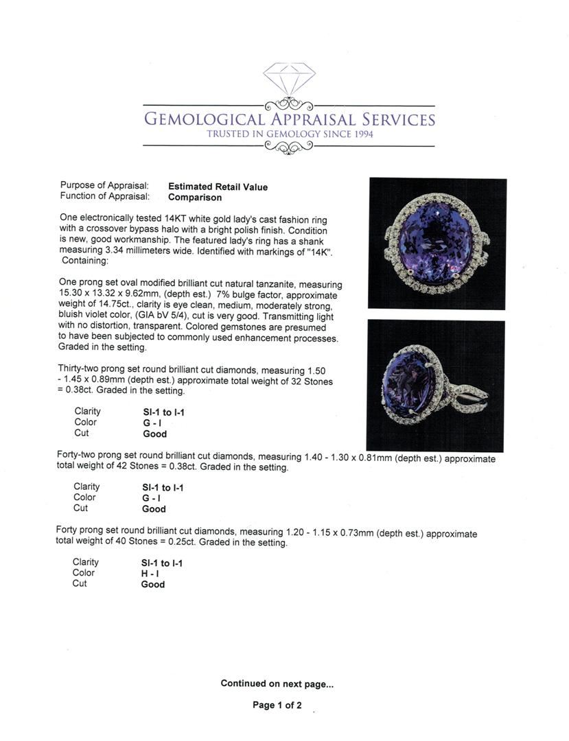 One electronically tested 14KT white gold lady's cast fashion ring with a crossover bypass halo with a bright polish finish. The featured lady's ring has a shank measuring 3.34 millimeters wide. Identified with markings of '14K'. Condition is new, good workmanship. Containing: One prong set oval modified brilliant cut natural tanzanite, measuring 15.30 x 13.32 x 9.62mm, (depth est.) 7%. bulge factor, approximate weight of 14.75ct., clarity is eye clean, medium, moderately strong, bluish violet color, (GIA bV 5/4), cut is very good. Transmitting light with no distortion, transparent. Colored gemstones are presumed to have been subjected to commonly used enhancement processes. Graded in the setting. Thirty-Two prong set round brilliant cut diamonds, measuring 1.50 - 1.45 x 0.89mm (depth est.) approximate total weight of 32 Stones = 0.38ct. Graded in the setting. Clarity SI-1 to I-1. Color: G - I Cut Good Forty-Two prong set round brilliant cut diamonds, measuring 1.40 - 1.30 x 0.81mm (depth est.) approximate total weight of 42 Stones = 0.38ct. Graded in the setting. Clarity SI-1 to I-1. Color: G - I Cut Good Forty prong set round brilliant cut diamonds, measuring 1.20 - 1.15 x 0.73mm (depth est.) approximate total weight of 40 Stones = 0.25ct. Graded in the setting. Clarity SI-1 to I-1. Color: H - I Cut Good. Total Weight of Colored Stones 14.75ct.. Total Weight of Diamonds 1.01ct.. Total Weight of Ring 10.50gm. GAS Appraised at $24,575.00.