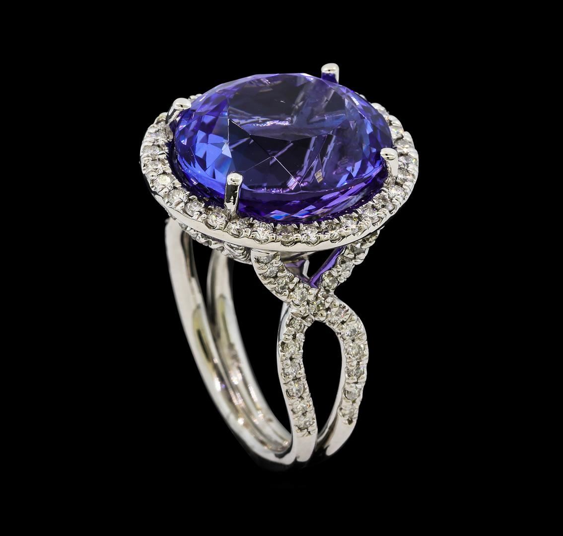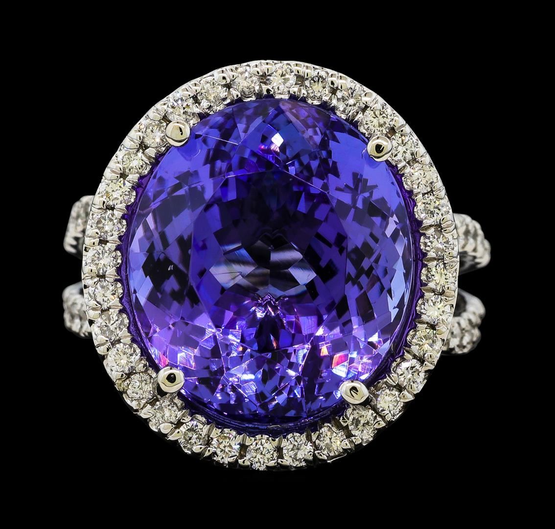 One electronically tested 14KT white gold lady's cast fashion ring with a crossover bypass halo with a bright polish finish. The featured lady's ring has a shank measuring 3.34 millimeters wide. Identified with markings of '14K'. Condition is new, good workmanship. Containing: One prong set oval modified brilliant cut natural tanzanite, measuring 15.30 x 13.32 x 9.62mm, (depth est.) 7%. bulge factor, approximate weight of 14.75ct., clarity is eye clean, medium, moderately strong, bluish violet color, (GIA bV 5/4), cut is very good. Transmitting light with no distortion, transparent. Colored gemstones are presumed to have been subjected to commonly used enhancement processes. Graded in the setting. Thirty-Two prong set round brilliant cut diamonds, measuring 1.50 - 1.45 x 0.89mm (depth est.) approximate total weight of 32 Stones = 0.38ct. Graded in the setting. Clarity SI-1 to I-1. Color: G - I Cut Good Forty-Two prong set round brilliant cut diamonds, measuring 1.40 - 1.30 x 0.81mm (depth est.) approximate total weight of 42 Stones = 0.38ct. Graded in the setting. Clarity SI-1 to I-1. Color: G - I Cut Good Forty prong set round brilliant cut diamonds, measuring 1.20 - 1.15 x 0.73mm (depth est.) approximate total weight of 40 Stones = 0.25ct. Graded in the setting. Clarity SI-1 to I-1. Color: H - I Cut Good. Total Weight of Colored Stones 14.75ct.. Total Weight of Diamonds 1.01ct.. Total Weight of Ring 10.50gm. GAS Appraised at $24,575.00.