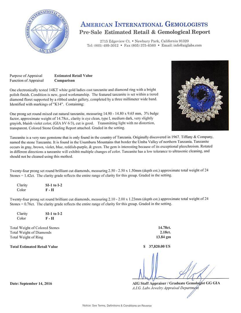 One electronically tested 14KT white gold ladies cast tanzanite and diamond ring with a bright polish finish. The featured tanzanite is set within a tiered diamond floret supported by a ribbed under gallery, completed by a three millimeter wide band. Identified with markings of 'K14'. Condition is new, good workmanship. Containing: One prong set round mixed cut natural tanzanite, measuring 14.90 - 14.80 x 9.65 mm, 3%. bulge factor, approximate weight of 14.78ct., clarity is eye clean, type I, medium dark, very slightly grayish, bluish violet color, (GIA bV 6/3), cut is good. Transmitting light with no distortion, transparent. Colored Stone Grading Report attached. Graded in the setting. Tanzanite is a very rare gemstone that is only found in the country of Tanzania. Originally discovered in 1967. Tiffany & Company, named the stone Tanzanite. It is found in the Usumburu Mountains that border the Umba Valley of northern Tanzania. Tanzanite occurs in gray, brown, violet, blue, reddish-purple, & green. The gem is interesting because of its exceptional pleochroism. Rotated in different directions a tanzanite will exhibit multiple changes of color. Tanzanite has a low tolerance to ultrasonic cleaning, and should not be cleaned using this method. Twenty-Four prong set round brilliant cut diamonds, measuring 2.50 - 2.50 x 1.50mm (depth est.) approximate total weight of 24 Stones = 1.42ct. The clarity grade reflects the entire range of clarity for this group. Graded in the setting. Clarity SI-1 to I-2. Color: F - H Twenty-Four prong set round brilliant cut diamonds, measuring 2.10 - 2.00 x 1.23mm (depth est.) approximate total weight of 24 Stones = 0.76ct. The clarity grade reflects the entire range of clarity for this group. Graded in the setting. Clarity SI-1 to I-2. Color: F - H. Total Weight of Colored Stones 14.78ct.. Total Weight of Diamonds 2.18ct.. Total Weight of Ring 13.84gm. AIG Appraised at $37,820.00.