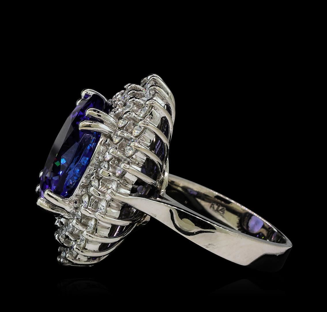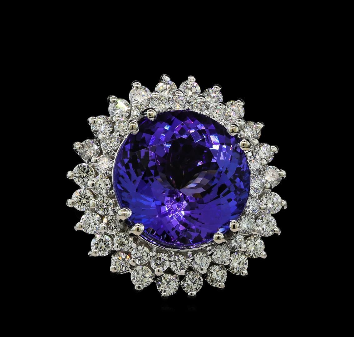 One electronically tested 14KT white gold ladies cast tanzanite and diamond ring with a bright polish finish. The featured tanzanite is set within a tiered diamond floret supported by a ribbed under gallery, completed by a three millimeter wide band. Identified with markings of 'K14'. Condition is new, good workmanship. Containing: One prong set round mixed cut natural tanzanite, measuring 14.90 - 14.80 x 9.65 mm, 3%. bulge factor, approximate weight of 14.78ct., clarity is eye clean, type I, medium dark, very slightly grayish, bluish violet color, (GIA bV 6/3), cut is good. Transmitting light with no distortion, transparent. Colored Stone Grading Report attached. Graded in the setting. Tanzanite is a very rare gemstone that is only found in the country of Tanzania. Originally discovered in 1967. Tiffany & Company, named the stone Tanzanite. It is found in the Usumburu Mountains that border the Umba Valley of northern Tanzania. Tanzanite occurs in gray, brown, violet, blue, reddish-purple, & green. The gem is interesting because of its exceptional pleochroism. Rotated in different directions a tanzanite will exhibit multiple changes of color. Tanzanite has a low tolerance to ultrasonic cleaning, and should not be cleaned using this method. Twenty-Four prong set round brilliant cut diamonds, measuring 2.50 - 2.50 x 1.50mm (depth est.) approximate total weight of 24 Stones = 1.42ct. The clarity grade reflects the entire range of clarity for this group. Graded in the setting. Clarity SI-1 to I-2. Color: F - H Twenty-Four prong set round brilliant cut diamonds, measuring 2.10 - 2.00 x 1.23mm (depth est.) approximate total weight of 24 Stones = 0.76ct. The clarity grade reflects the entire range of clarity for this group. Graded in the setting. Clarity SI-1 to I-2. Color: F - H. Total Weight of Colored Stones 14.78ct.. Total Weight of Diamonds 2.18ct.. Total Weight of Ring 13.84gm. AIG Appraised.