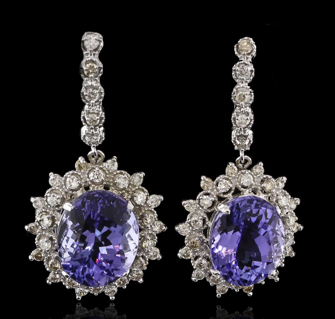 One pair electronically tested 14KT white gold ladies cast tanzanite and diamond earrings with hinged clip backs with a bright polish finish. Identified with markings of "14K". Condition is new. Containing: Two prong set oval modified brilliant cut natural tanzanites, measuring 13.60 x 10.90 x 7.09mm, approximate. Total Weight of 14.78ct., clarity is eye clean, type I, medium light, very slightly grayish, violet color, (GIA V 4/3), cut is good. Sixty-Six prong set round brilliant cut diamonds, measuring 1.60 - 1.00 x 0.78mm (depth est.) approximate. Total Weight of 66 Stones = 0.53ct. Clarity: SI-2. Color: J - K, Cut is Good. Colored gemstones are presumed to have been subjected to commonly used enhancement processes. All diamonds and colored gemstones are graded in the mounting, unless otherwise stated. Total Weight of Colored Stones 14.78ct. Total Weight of Diamonds 0.53ct. Total Weight of Earrings 11.20 grams. GGL Appraised at $7,380.00.