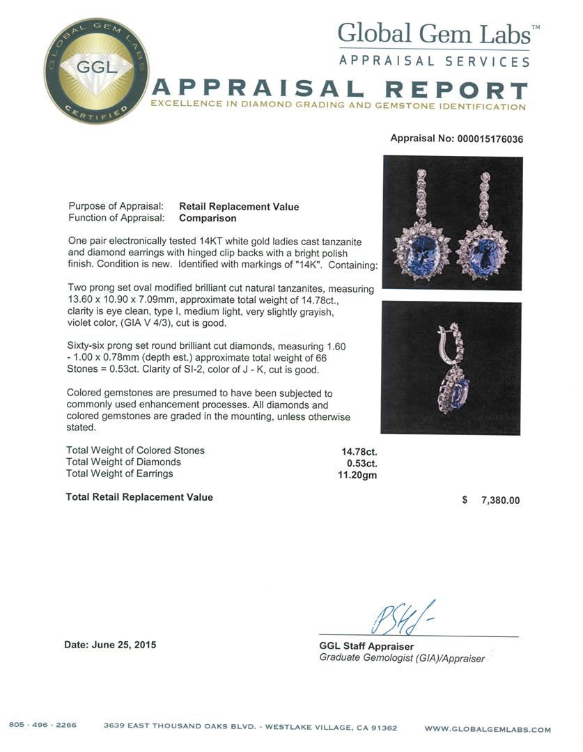 One pair electronically tested 14KT white gold ladies cast tanzanite and diamond earrings with hinged clip backs with a bright polish finish. Identified with markings of "14K". Condition is new. Containing: Two prong set oval modified brilliant cut natural tanzanites, measuring 13.60 x 10.90 x 7.09mm, approximate. Total Weight of 14.78ct., clarity is eye clean, type I, medium light, very slightly grayish, violet color, (GIA V 4/3), cut is good. Sixty-Six prong set round brilliant cut diamonds, measuring 1.60 - 1.00 x 0.78mm (depth est.) approximate. Total Weight of 66 Stones = 0.53ct. Clarity: SI-2. Color: J - K, Cut is Good. Colored gemstones are presumed to have been subjected to commonly used enhancement processes. All diamonds and colored gemstones are graded in the mounting, unless otherwise stated. Total Weight of Colored Stones 14.78ct. Total Weight of Diamonds 0.53ct. Total Weight of Earrings 11.20 grams. GGL Appraised at $7,380.00.