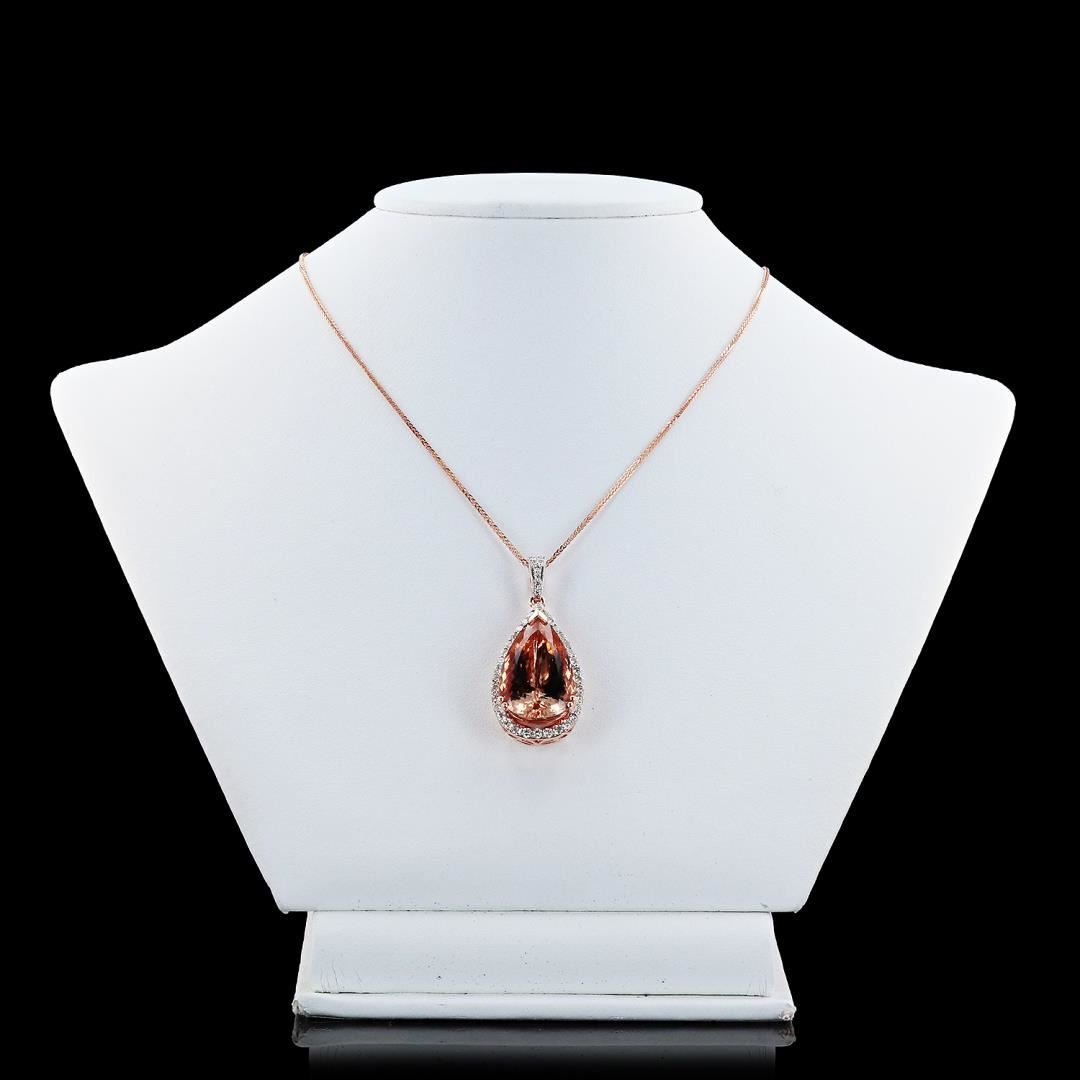 One polished, stamped, and tested, 14K rose gold pendant marked Oscar Friedman. The pendant is mounted with: 1 genuine morganite center stone weighing approximately 14.80 carat, and 44 genuine round diamonds weighing approximately 0.98 carats. The pendant hangs from a 14K rose gold link chain necklace measuring 18 inches in length. This item weighs 10.3 grams, condition is new, excellent workmanship. #MAIN GEMSTONE# Species: Natural Beryl; Variety: Morganite; Shape: Pear; Cutting Style: Modified Brilliant Cut; Measurements: 23.5 x 13.5mm; Weight: 14.80 carat; Color: Brownish Orange; Cut Grade: Very Good; Refractive Index: 1.583 - 1.590 DR; Birefringence: 0007-0008; Hardness: 7.5-8 #ADJACENT GEMSTONES ON PENDANT# Identity: Natural Diamond; Shape: Round; Cutting Style: Brillant Cut; Quantity: 44 Diamonds; Measurements: 1.0 - 1.8mm; Total Weight: 0.98 carats; Color Grade: H-I; Clarity Grade: SI2-I1; Refractive Index: 2.417; Hardness: 10; MORGANITE WEIGHT: 14.80 ct; TOTAL DIAMOND WEIGHT: 0.98 cts; WEIGHT OF ITEM: 10.3 grams; GOLD CONTENT: 14K Rose Gold #Size: 18