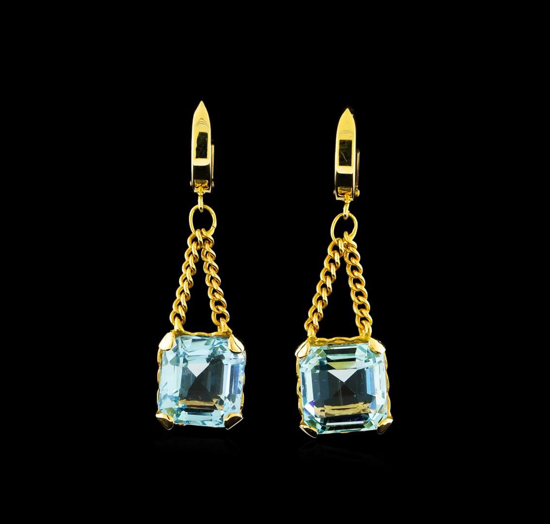 One pair electronically tested 14KT yellow gold ladies cast & assembled aquamarine solitaire earrings with hinged, snap locking posts. Each earring features an aquamarine solitaire dangle supported by two yellow gold link ribbons, completed by a yellow gold huggie. Bright polish finish. Identified with markings of "14K". Condition is good. Containing: One prong set emerald step cut natural aquamarine, measuring 11.58 x 10.75 x 7.70mm, 6%. bulge factor, approximate total weight of 7.46ct., clarity is eye clean, type I, medium, very slightly grayish, very slightly greenish blue color, (GIA vslgB 5/3), cut is good. Transmitting light with no distortion, transparent. Refractive index testing results of 1.57 to 1.58. This is a conclusive result for beryl (aquamarine). Graded in the setting. One prong set emerald step cut natural aquamarine, measuring 11.75 x 10.75 x 7.50mm, 6%. bulge factor, approximate weight of 7.37ct., clarity is eye clean, type I, medium, very slightly grayish, very slightly greenish blue color, (GIA vslgB 5/3), cut is good. Transmitting light with no distortion, transparent. Refractive index testing results of 1.57 to 1.58. This is a conclusive result for beryl (aquamarine). Graded in the setting. Total Weight of Colored Stones 14.83ct. Total Weight of Earrings 8.21gm. AIG Appraised at $8,490.00.
