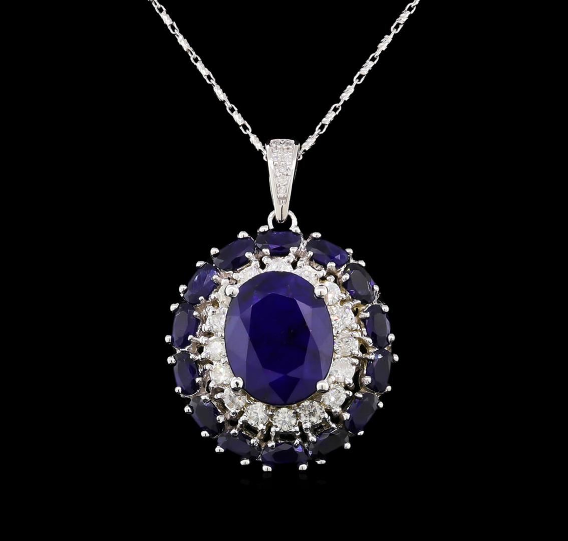 14K Gold Sapphire & Diamond Pendant. One polished, stamped, and tested 14K white gold pendant mounted with: 15 faceted sapphires weighing 14.83 carats, and 25 faceted round diamonds weighing 1.11 carats. The pendant hangs on a 14 K white gold link chain measuring 18 inches in length. This item weighs 14.9 grams, condition is new, excellent workmanship. Species: Natural Corundum. Variety: Sapphire. Shape: oval. Cutting style: Brilliant cut crown step cut pavilion. Quantity: 15 sapphires. Measurements: 5x3-15x12 mm. Total weight: 14.83 carats. Color: blue. Cut grade: very good. Treatment: Heat/fracture filled. Refractive index: 1.762-1.770 DR. Birefringence: 0.008-0.010. Hardness: 9. Adjacent Gemstones on Pendant: Identity: Natural diamond. Shape: Round. Cutting style: brilliant cut. Quantity: 25 diamonds. Measurements: 1.0-2.5 mm. Total weight: 1.11 carats. Clarity grade: SI1-SI3. color grade: I-J. Refractive index: 2.418. Hardness: 10. AIGL Appraised at $8,658.00.