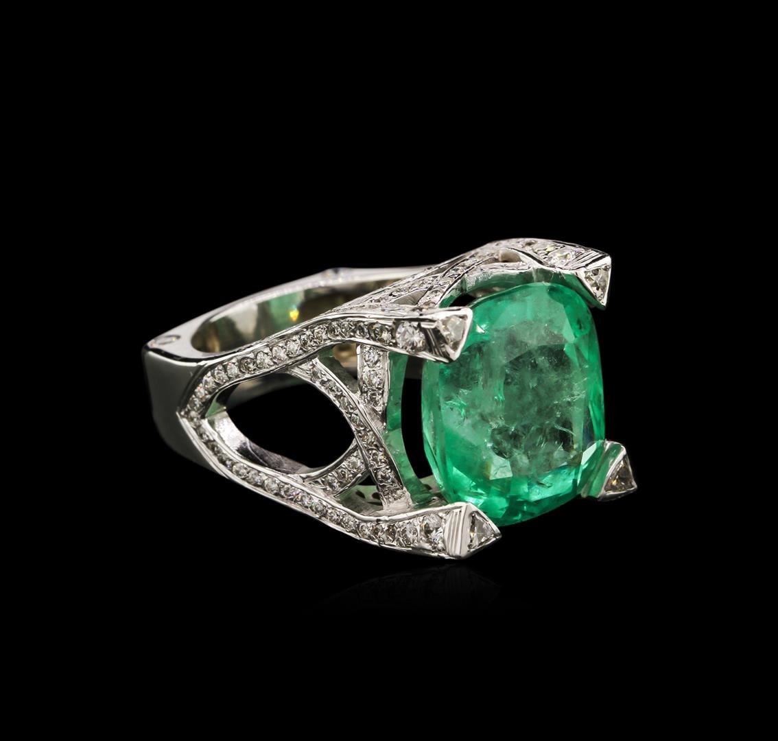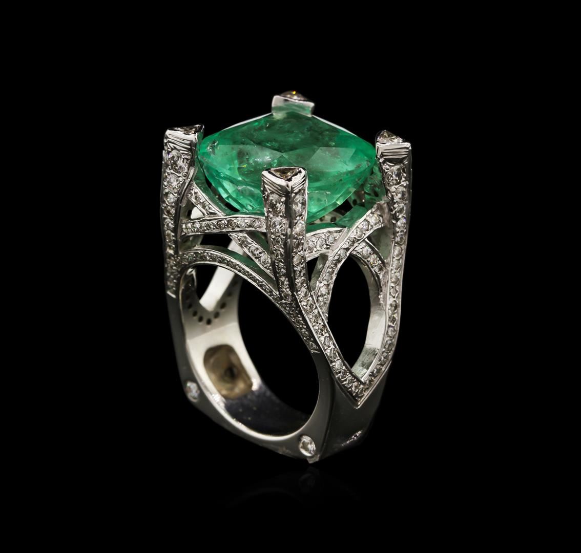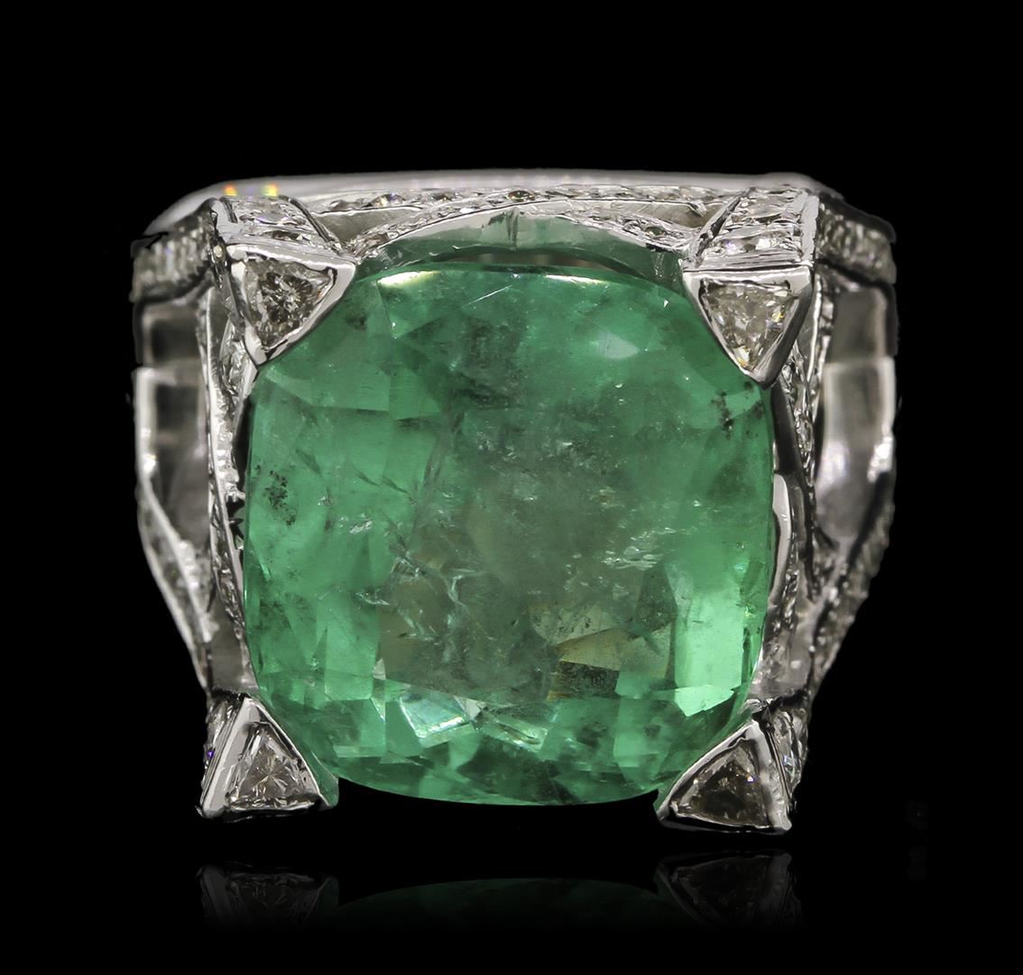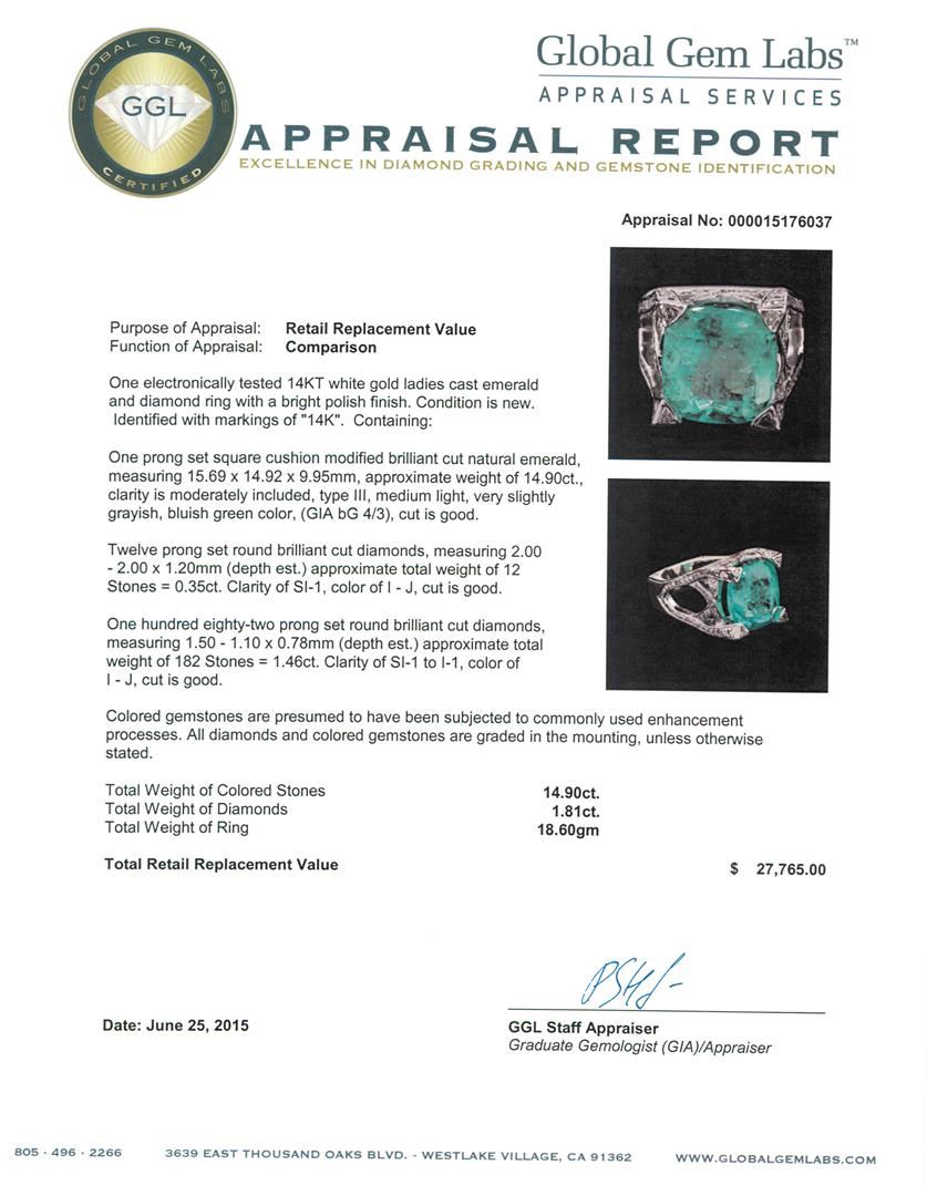 One electronically tested 14KT white gold ladies cast emerald and diamond ring with a bright polish finish. Identified with markings of "14K". Condition is new. Containing: One prong set square cushion modified brilliant cut natural emerald, measuring 15.69 x 14.92 x 9.95mm, approximate weight of 14.90ct., clarity is moderately included, type III, medium light, very slightly grayish, bluish green color, (GIA bG 4/3), cut is good. Twelve prong set round brilliant cut diamonds, measuring 2.00 - 2.00 x 1.20mm (depth est.) approximate. Total Weight of 12 Stones = 0.35ct. Clarity: SI-1. Color: I - J, Cut is Good. One Hundred Eighty-Two prong set round brilliant cut diamonds, measuring 1.50 - 1.10 x 0.78mm (depth est.) approximate. Total Weight of 182 Stones = 1.46ct. Clarity: SI-1 to I-1. Color: I - J, Cut is Good. Colored gemstones are presumed to have been subjected to commonly used enhancement processes. All diamonds and colored gemstones are graded in the mounting, unless otherwise stated. Total Weight of Colored Stones 14.90ct. Total Weight of Diamonds 1.81ct. Total Weight of Ring 18.60 grams. GGL Appraised at $27,765.00.