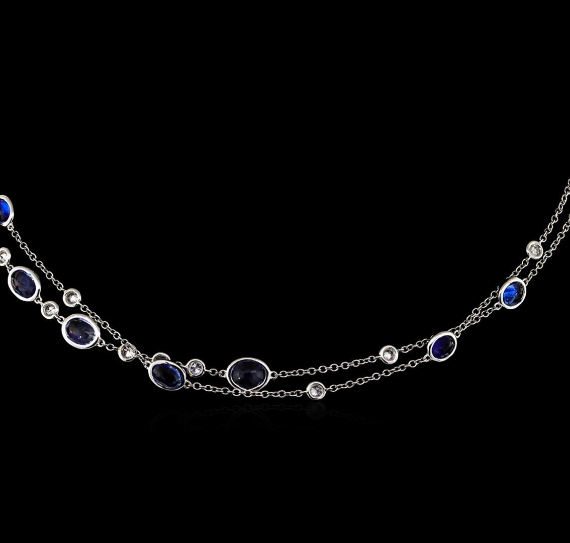 One electronically tested 14KT white gold ladies cast & assembled sapphire and diamond necklace. Thirty and one-quarter inch length necklace features sapphires and diamonds linked between 14KT white gold designer style chain terminating in a lobster claw clasp with a two inch extender chain. Bright polish finish. Trademark is MICHA. Identified with markings of "14K 585". Condition is new, good workmanship. Containing: Sixteen bezel set oval mixed cut natural blue sapphires approximate total weight of 14.90ct., clarity is slightly included, type II, medium dark, very slightly grayish, violetish blue color, (GIA vB 6/3), cut is good. Transmitting light with a minimum of distortion, transparent. Naturally occurring internal & external characteristics are present, including partial color zoning. Color grade is an average for the group. Graded in the setting. Twenty-Three bezel set round brilliant cut diamonds approximate total weight of 23 Stones = 1.51ct. Graded in the setting. Clarity: SI-2 to I-2. Color: G - I. Total Weight of Colored Stones 14.90ct. Total Weight of Diamonds 1.51ct. Total Weight of Necklace 13.07gm. AIG Appraised at $14,700.00.