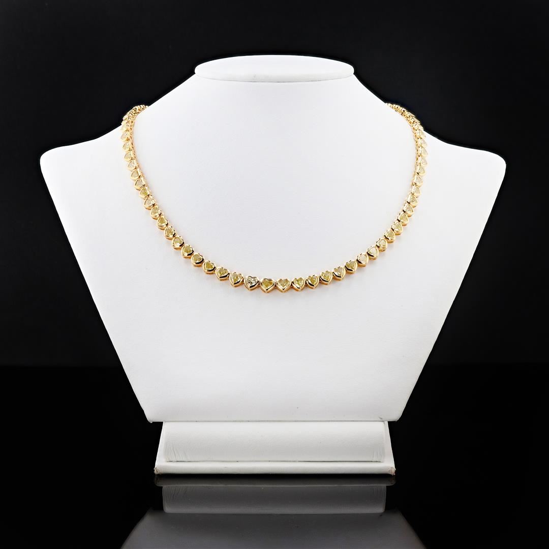 Description: One Oscar Friedman 18K Yellow Gold Diamond Necklace Weight: 29.58 grams Containing: Eighty-Four Heart Brilliant Cut Diamonds Total Weight: 14.92 carats Average Color: Light Yellow to Fancy Yellow Average Clarity: SI1-I1 Setting Style: Bezel Necklace Length: 16 3/4"