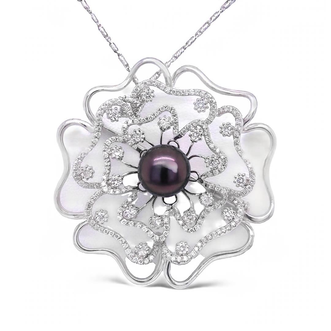 14 Karat Tahitian Pearl Pendant. Please see Photos and Description for all available information. This 14K white gold pendant features a Tahitian pearl and a floral design that is studded with sparkling diamonds. This piece is a great addition to your jewelry collection. The Tahitian pearl is a rare gem that is not easily found. The pearl surface is lustrous and iridescent, which makes it a great piece to add to your jewelry collection.