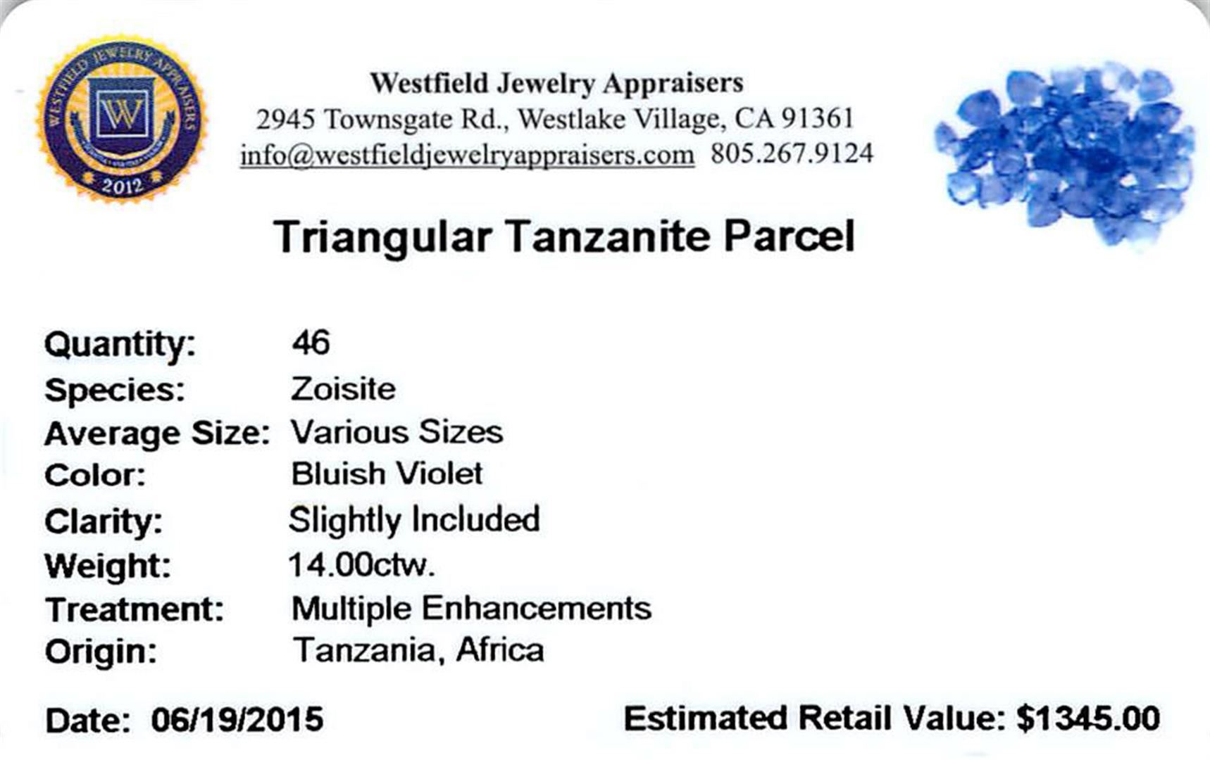 Forty-six triangle mixed cut natural tanzanites exact total weight 14.00ct., clarity is slightly included, type I, medium dark, very slightly grayish, bluish violet color, (GIA bV 6/3), cut is good. Transmitting light with a minimum of distortion, transparent. Naturally occurring internal & external characteristics are present. Color grade is an average for the group. Tanzanite is a very rare gemstone that is only found in the country of Tanzania. Originally discovered in 1967. Tiffany & Company, named the stone Tanzanite. It is found in the Usumburu Mountains that border the Umba Valley of northern Tanzania. Tanzanite occurs in gray, brown, violet, blue, reddish-purple, & green. The gem is interesting because of its exceptional pleochroism. Rotated in different directions a tanzanite will exhibit multiple changes of color. Tanzanite has a low tolerance to ultrasonic cleaning, and should not be cleaned using this method. Westfield Appraised at $1,345.00.