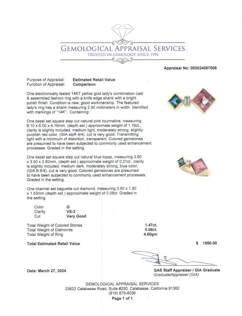 Designed with a contemporary aesthetic, this 14kt yellow gold fashion ring features a knife-edge shank and a vibrant combination of gemstones. A bezel-set square step-cut natural pink tourmaline (1.16ct) showcases a medium light, slightly purplish red hue, while a bezel-set square step-cut natural blue topaz (0.31ct) adds a striking contrast with its moderately strong blue color. Completing the design, a channel-set baguette-cut diamond (0.08ct, G color, VS-2 clarity, Very Good cut) brings a refined touch of brilliance. The polished gold setting enhances the dynamic interplay of colors, making this ring a bold and artistic statement piece.