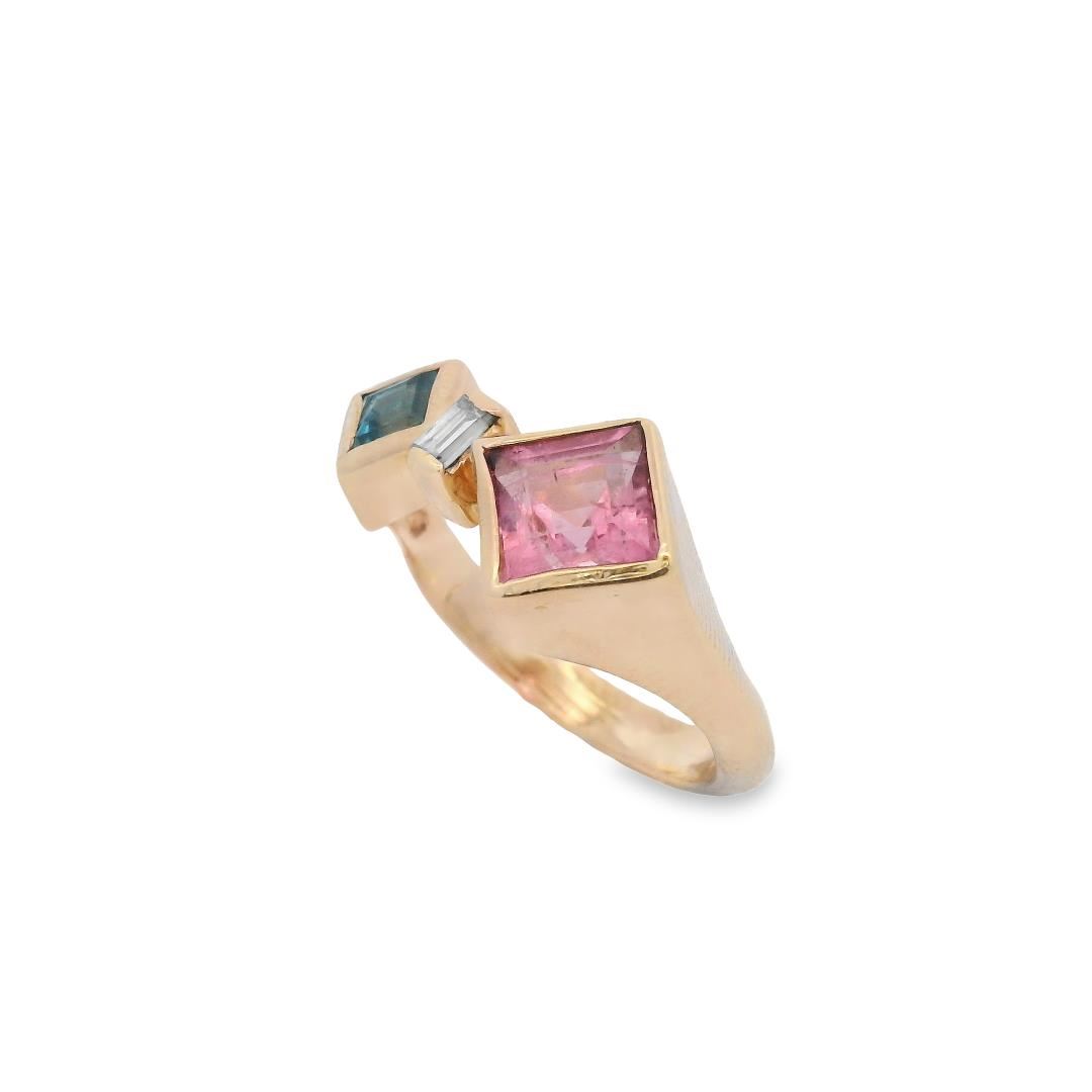 Designed with a contemporary aesthetic, this 14kt yellow gold fashion ring features a knife-edge shank and a vibrant combination of gemstones. A bezel-set square step-cut natural pink tourmaline (1.16ct) showcases a medium light, slightly purplish red hue, while a bezel-set square step-cut natural blue topaz (0.31ct) adds a striking contrast with its moderately strong blue color. Completing the design, a channel-set baguette-cut diamond (0.08ct, G color, VS-2 clarity, Very Good cut) brings a refined touch of brilliance. The polished gold setting enhances the dynamic interplay of colors, making this ring a bold and artistic statement piece.