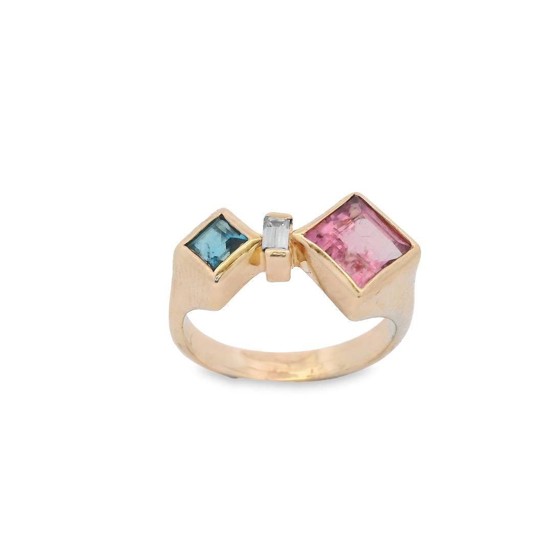 Designed with a contemporary aesthetic, this 14kt yellow gold fashion ring features a knife-edge shank and a vibrant combination of gemstones. A bezel-set square step-cut natural pink tourmaline (1.16ct) showcases a medium light, slightly purplish red hue, while a bezel-set square step-cut natural blue topaz (0.31ct) adds a striking contrast with its moderately strong blue color. Completing the design, a channel-set baguette-cut diamond (0.08ct, G color, VS-2 clarity, Very Good cut) brings a refined touch of brilliance. The polished gold setting enhances the dynamic interplay of colors, making this ring a bold and artistic statement piece.