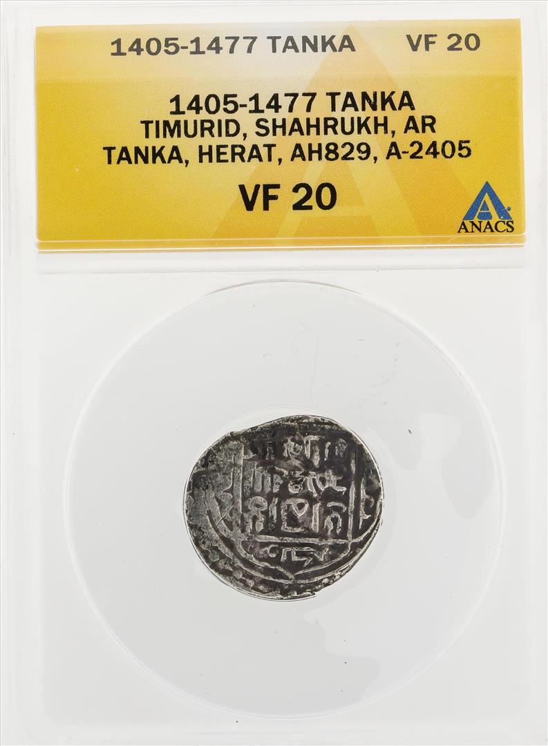 One 1405-1477 Tanka Timurid Shahrukh AR Tanka Herat AH829 A-2405 Coin ANACS VF20. ANACS Appraised.