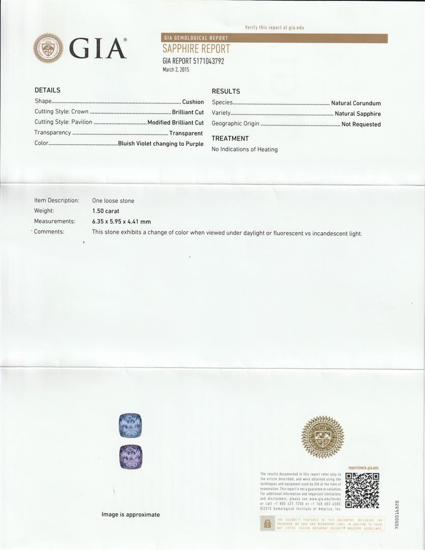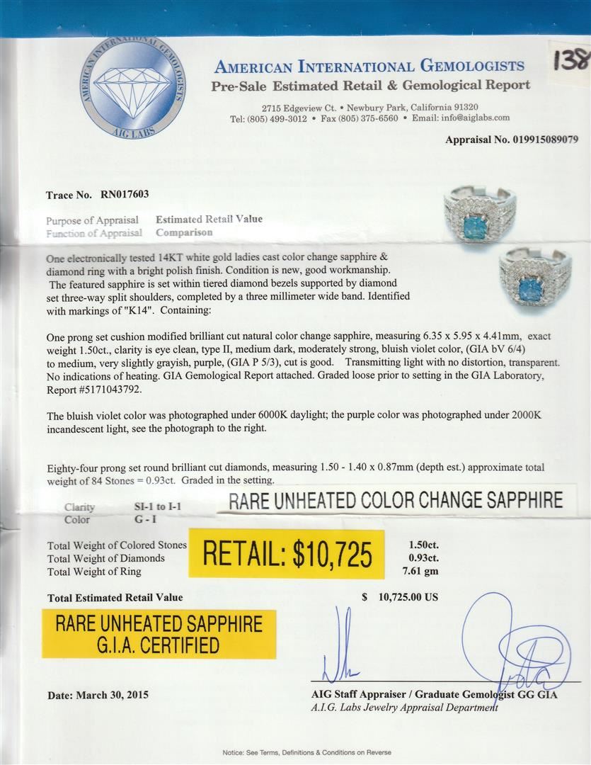 14K Color Change Sapphire Ring 1.50ct. Please see Photos and Description for all available information. This elegant and chic ring features a single round cut sapphire in 14K white gold. The stone is surrounded by a thin bezel and a brushed finish on the band. This ring is a great choice for stylish women who want to make a bold statement.