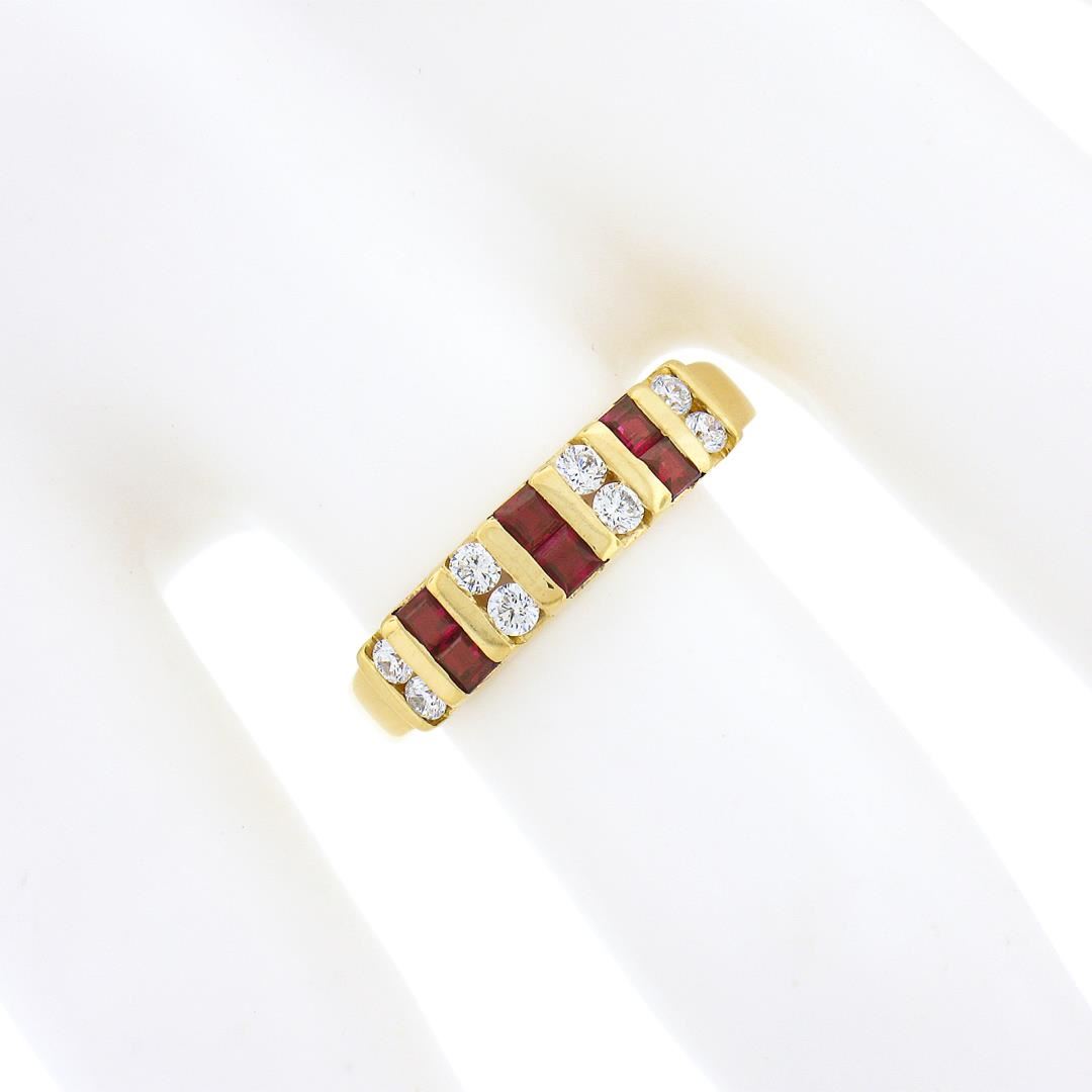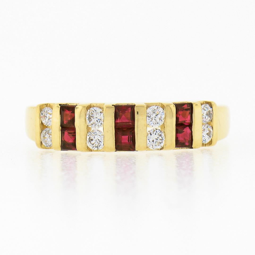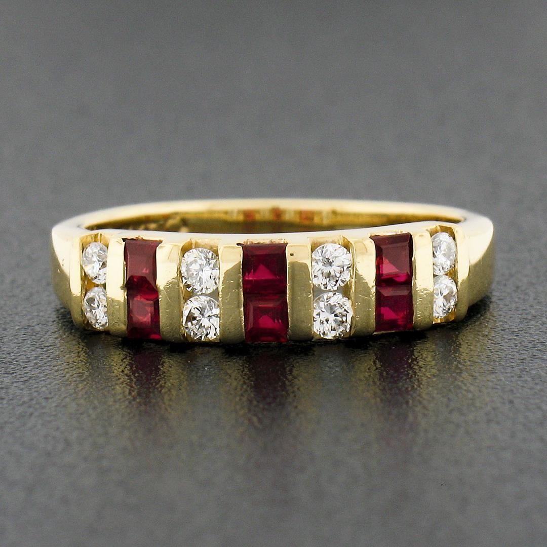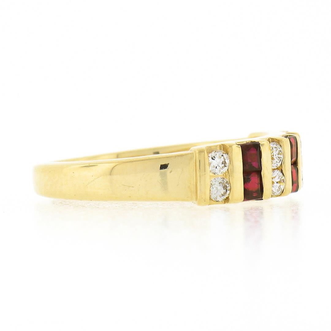 A solid 14k yellow gold band ring, alternated 6 square step cut natural runbies (0.30ctw ), and 8 round cut natural diamonds (F/G - VS1/VS2 ; 0.24ctw). The ring is size 5.5, weighs a total of 2.85 grams, and measures 4.45mm wide.