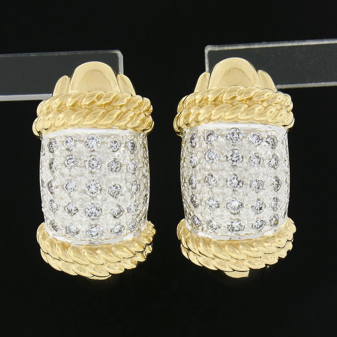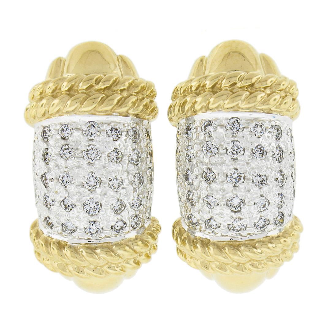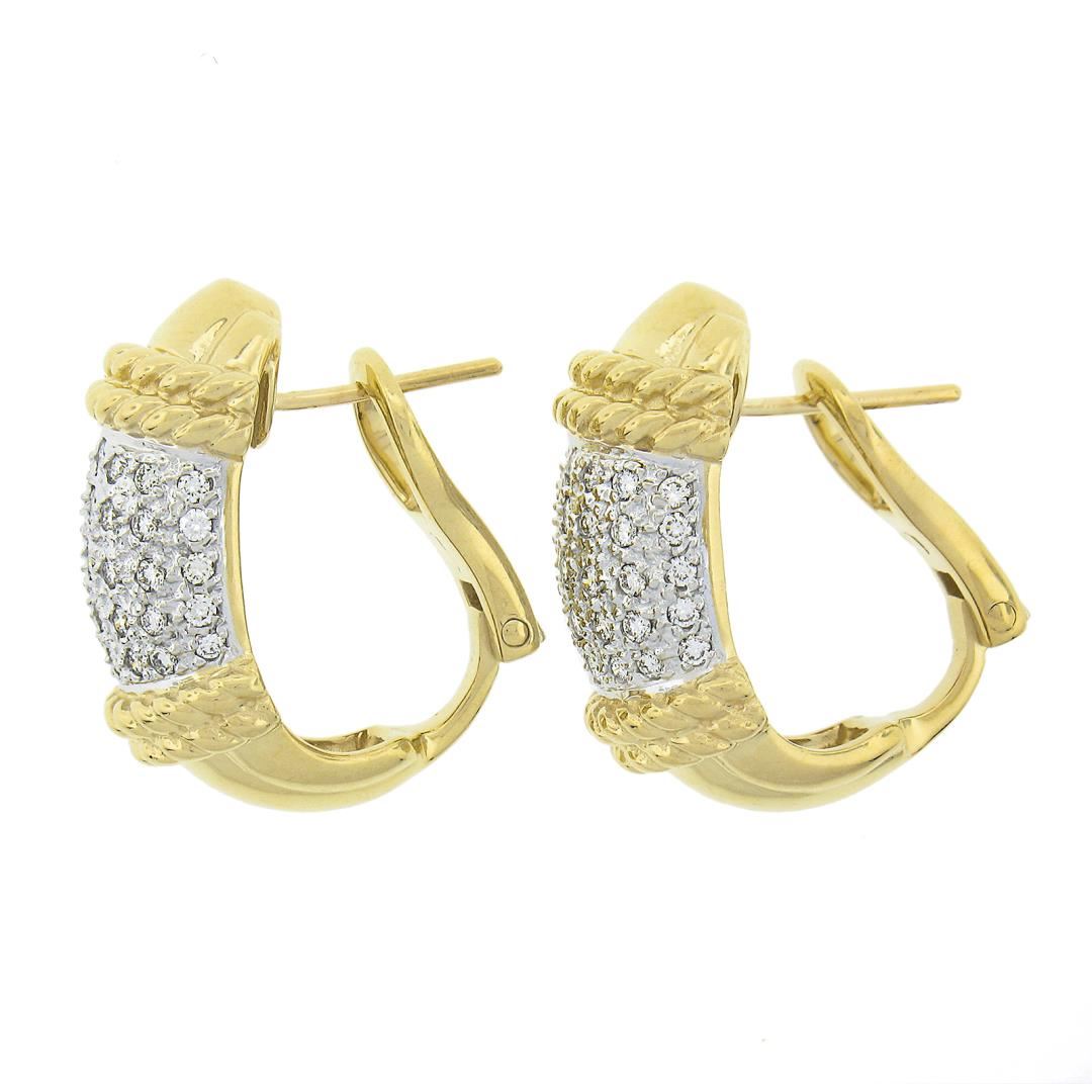 A solid 14k yellow gold & rhodium plated cuff earrings, with round brilliant cut natural diamonds (F/G - VS1/VS2 ; 0.70ctw). The earrings measure approximately 22.8x11.6mm and weigh a total of 13.03 grams.