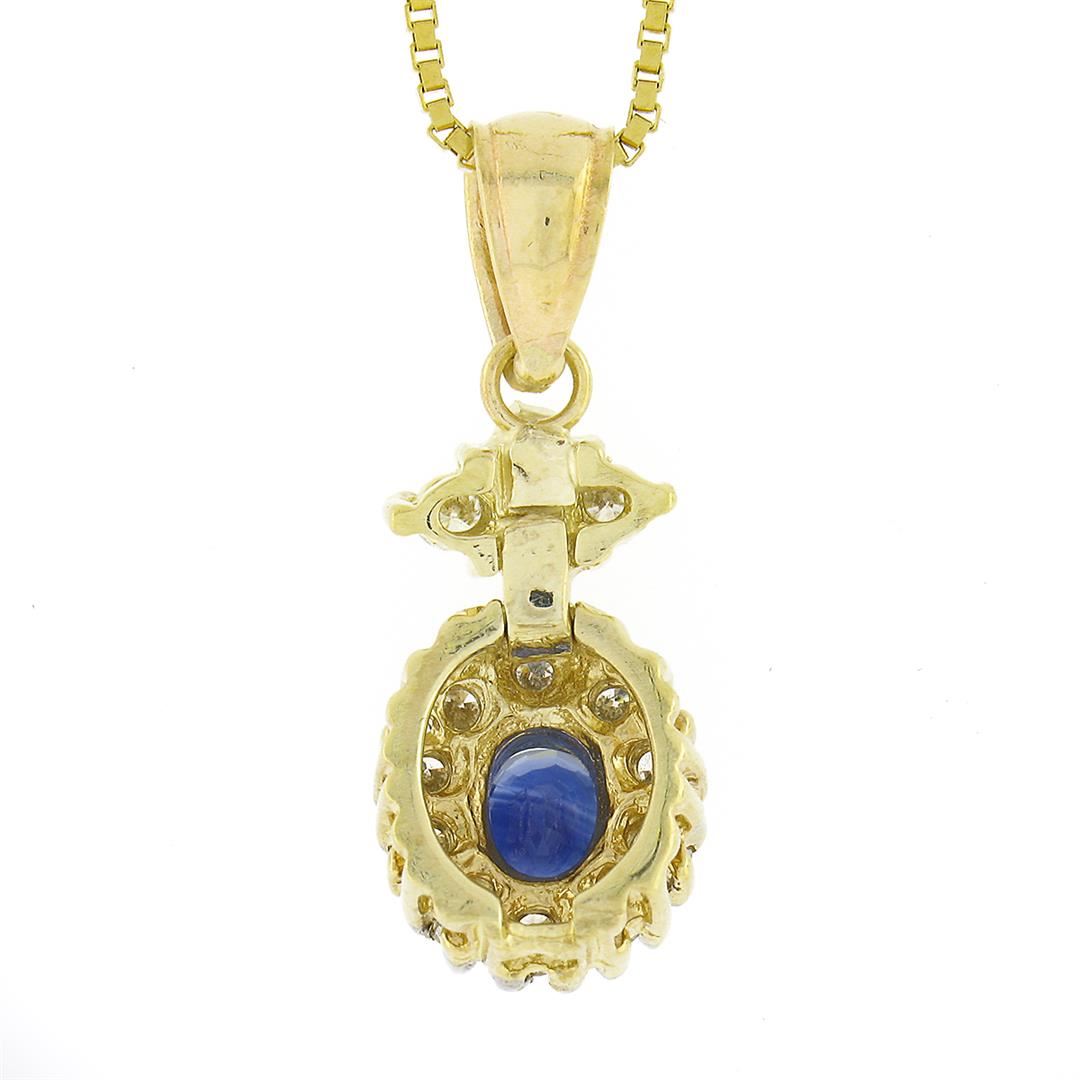 A solid 14k yellow gold pendant necklace, with 1 oval brilliant cut natural blue sapphire (0.40ctw), surrounded with 14 round brilliant cut natural diamonds (H/I - SI2/I1 ; 0.45ctw). The pendant weighs a total of 4.27 grams, measures 21.0x8.20mm including