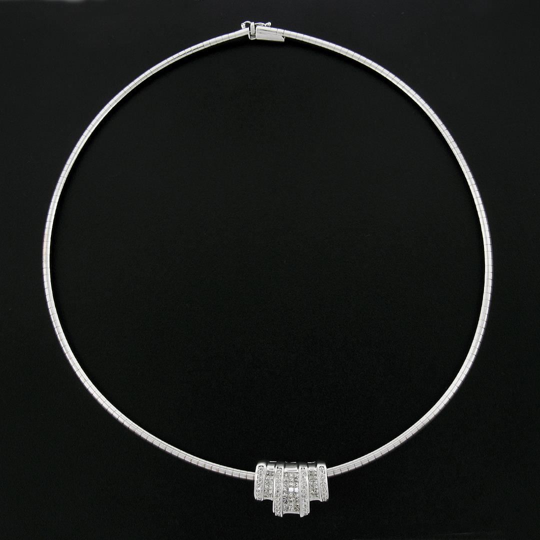 A solid 14k white gold pendant necklace, with 48 princess cut natural diamonds (H/I - VS2/SI1 ; 0.90ctw ), and 34 round brilliant cut natural diamonds (H/I - SI2/I1 ; 0.25ctw). 16 inch omega link chain, 24.21 grams total weight, pendant measures 15.7x20.8mm.