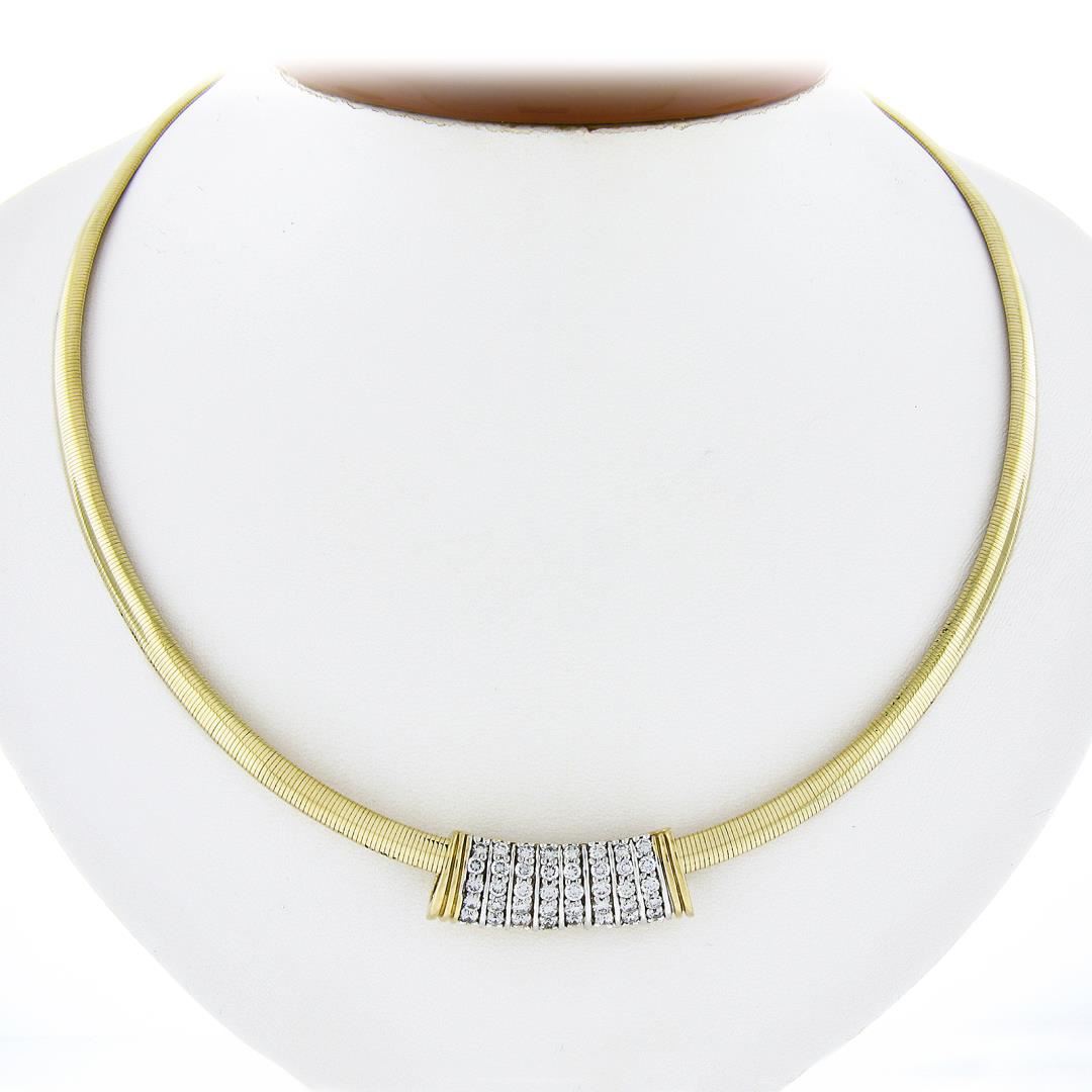 A solid 14k yellow gold pendant necklace, with 48 round brilliant cut natural diamonds (G/H - VS1/VS2 & a few SI1 ; 1.75ctw). 17.5 inch omega link chain, 23.18 grams total weight, pendant measures 12.6x32.4mm.