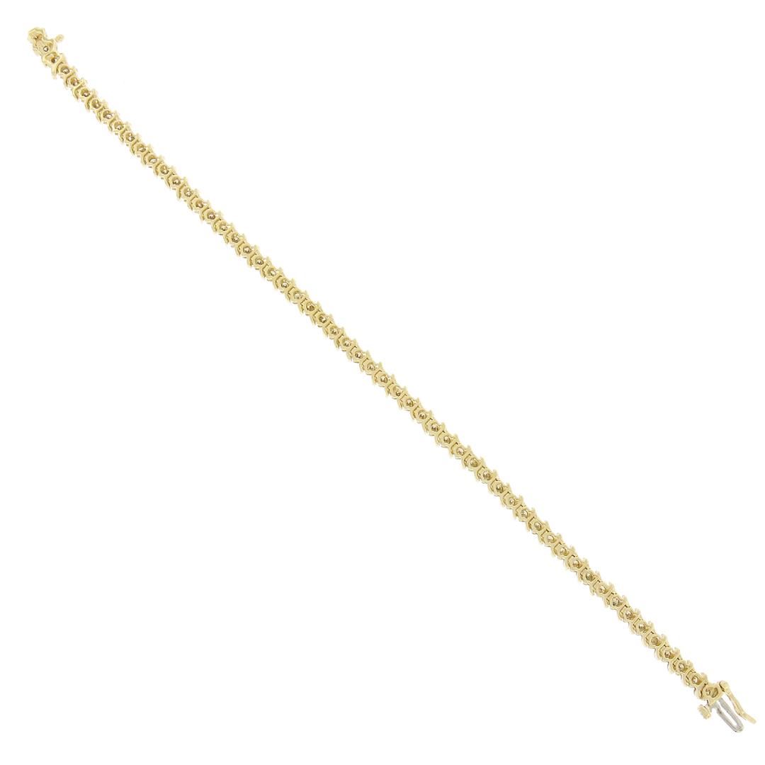 A solid 14k yellow gold tennis bracelet, with 55 round brilliant cut fancy champagne natural diamonds (SI2/I2 ; 1.75ctw ). It weighs a total of 13.50 grams, measures 4.7mm wide, and measures 7.5 inches in length.