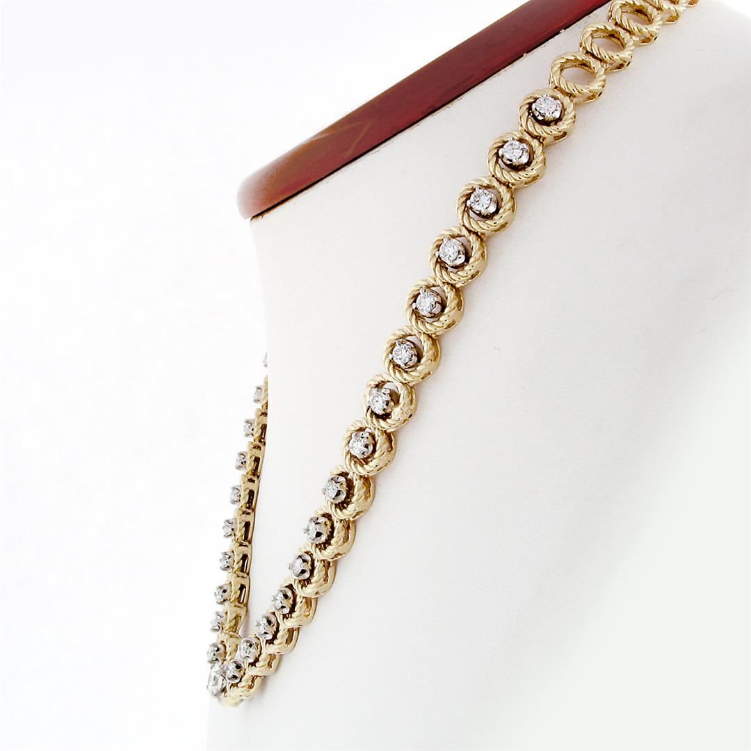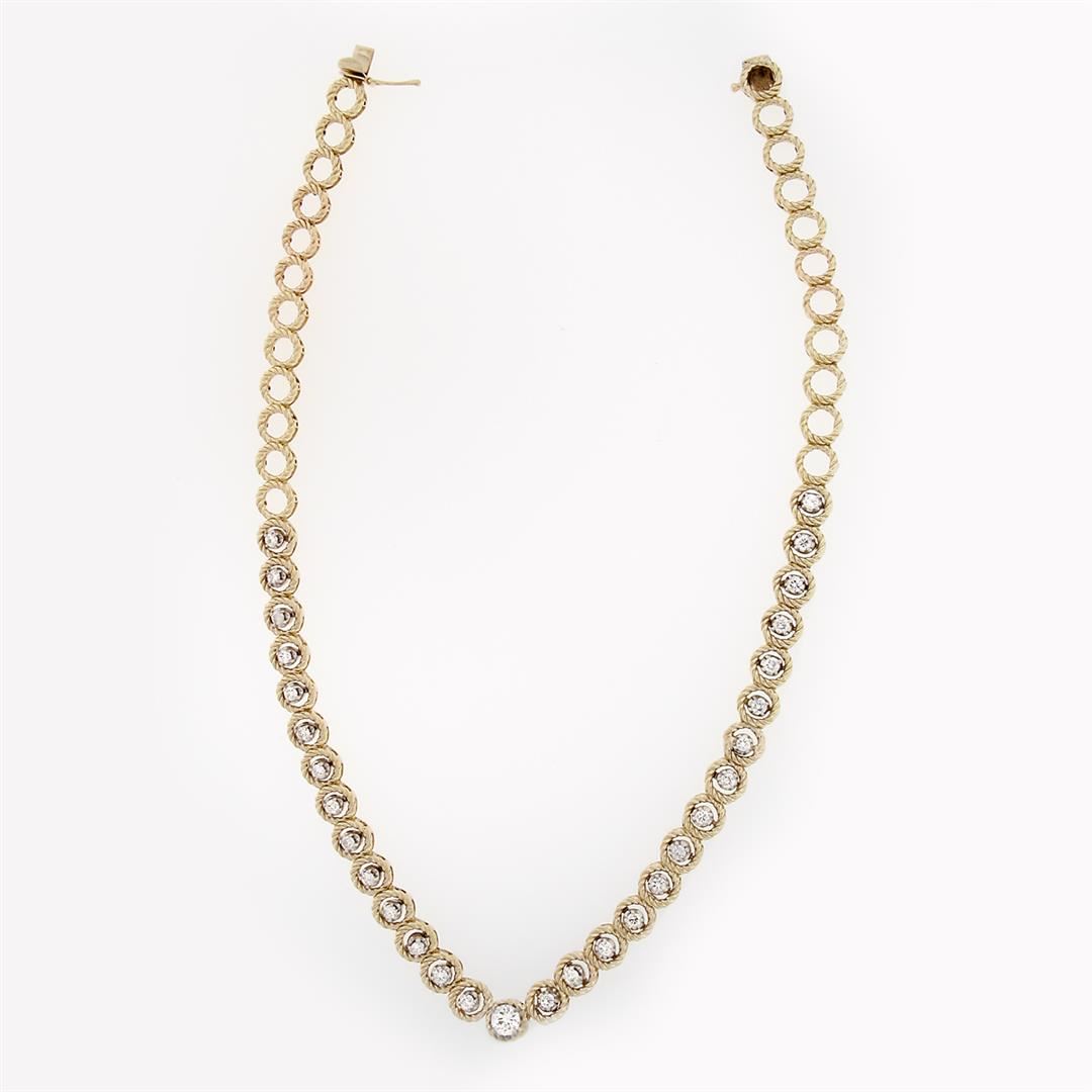 A solid 14k yellow gold choker necklace, with 1 round brilliant cut natural diamond (F - VS1 Clarity; 0.56ct), and 29 round brilliant cut natural diamonds (G/H - VS2-SI2; 1.65ctw). 15 inch twisted cable circle link chain, 48.03 grams total weight.