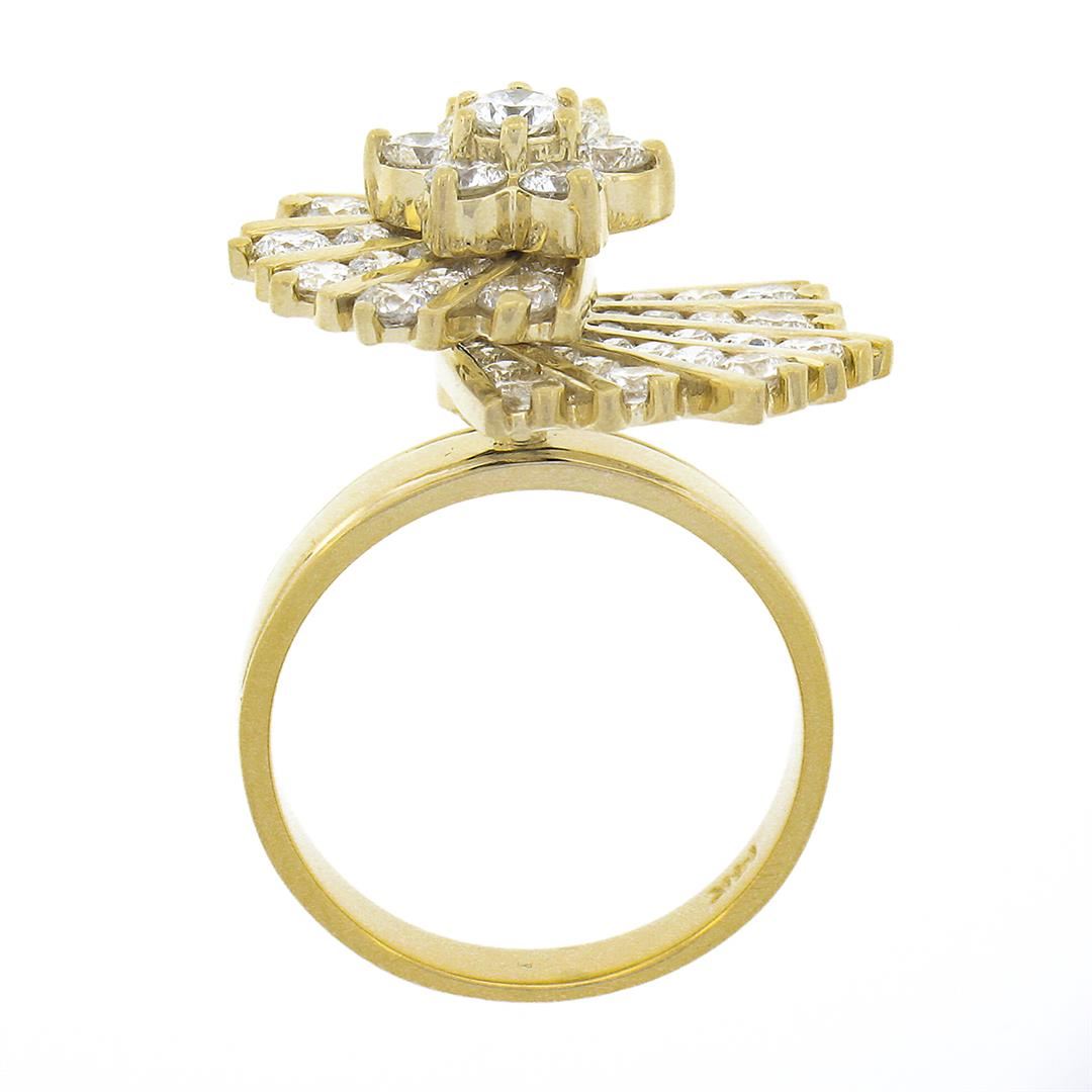 A solid 14k yellow gold spinning fan cocktail ring, with 46 round brilliant cut natural diamonds (G/H - VS2/SI2 ; 2.30ctw). The ring is size 7.5, weighs a total of 8.43 grams, and measures 9.40mm wide.