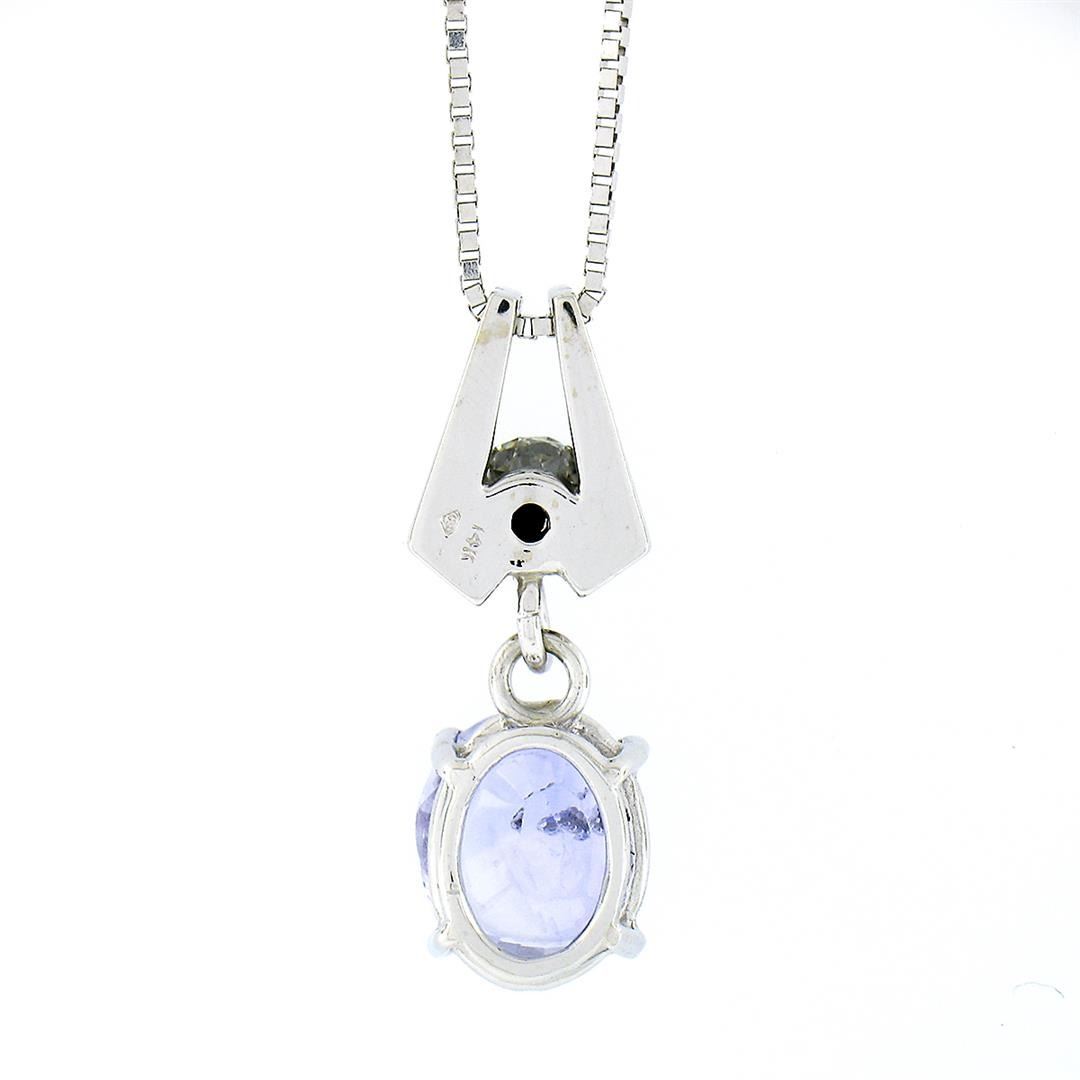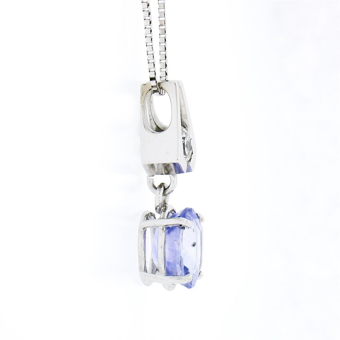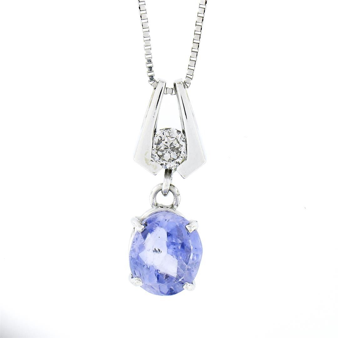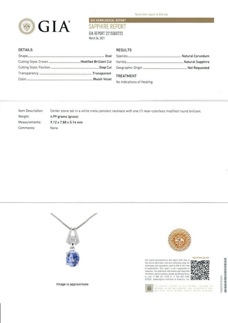 A solid 14k white gold pendant necklace, with 1 Gia certified oval brilliant cut natural sapphire (9.12x7.88mm - 3.10ct), and 1 octagonal cut natural diamond (G - VS2 ; 0.30ct). 19 inch box link chain, 4.99 grams total weight, pendant measures 23.45x8.1mm. Comes with all original relevant certifications.