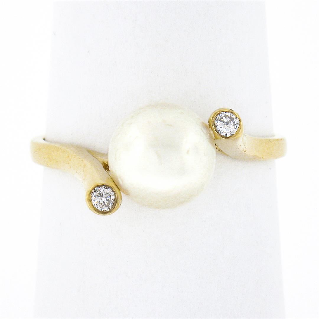An estate solid 14k yellow gold bypass 3 stones ring, featuring 1 round shape natural pearl (7.65mm), accented with 2 round brilliant cut natural diamonds (G/H - VS2 ; 0.06ctw ). The ring is size 7.0, weighs a total of 2.42 grams, and measures 12.20mm wi