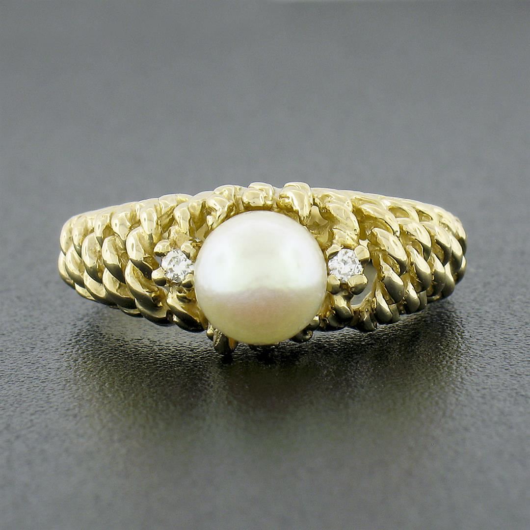 A solid 14k yellow gold ring, with 1 round shape cultured pearl (6.3mm), and 2 round brilliant cut natural diamonds (G/H - VS2/SI1 ; 0.04ctw). The ring is size 6.0, weighs a total of 4.66 grams, and measures 8.10mm wide.