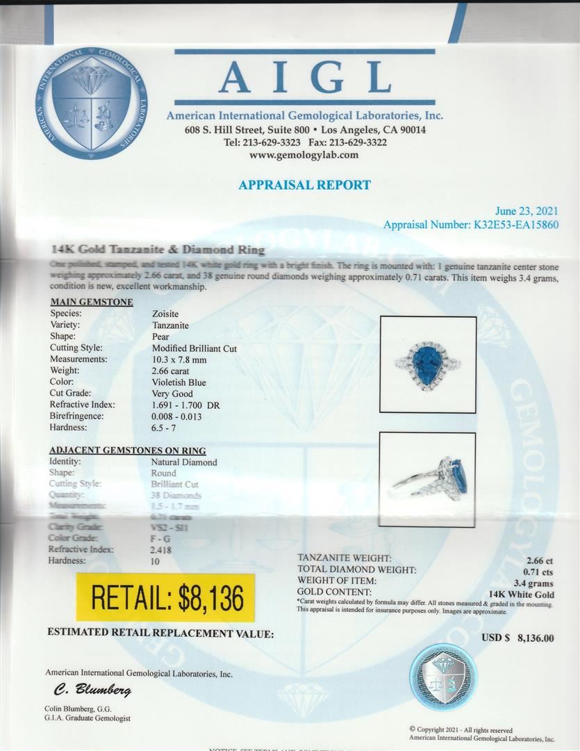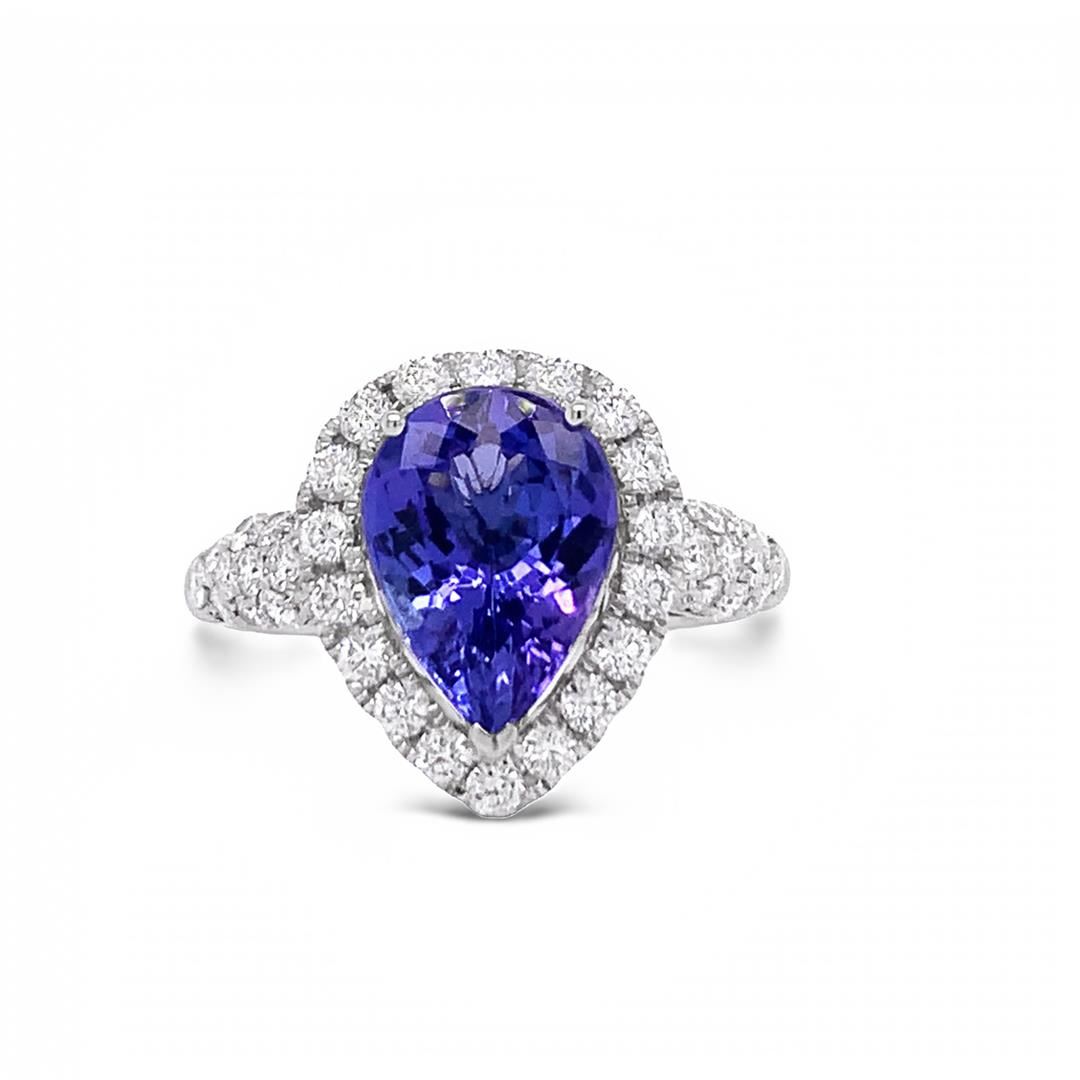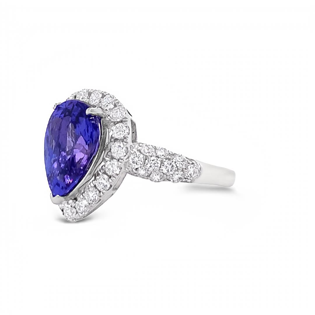 14K Pear Shaped Tanzanite Ring 2.66ct. Please see Photos and Description for all available information. This beautiful 14K white gold ring features a 2.66ct pear shaped tanzanite center stone. This stone is the ideal shade of purple, with a rich tone and a vibrant hue. It's an excellent choice for those who want a unique alternative to traditional diamond engagement rings.