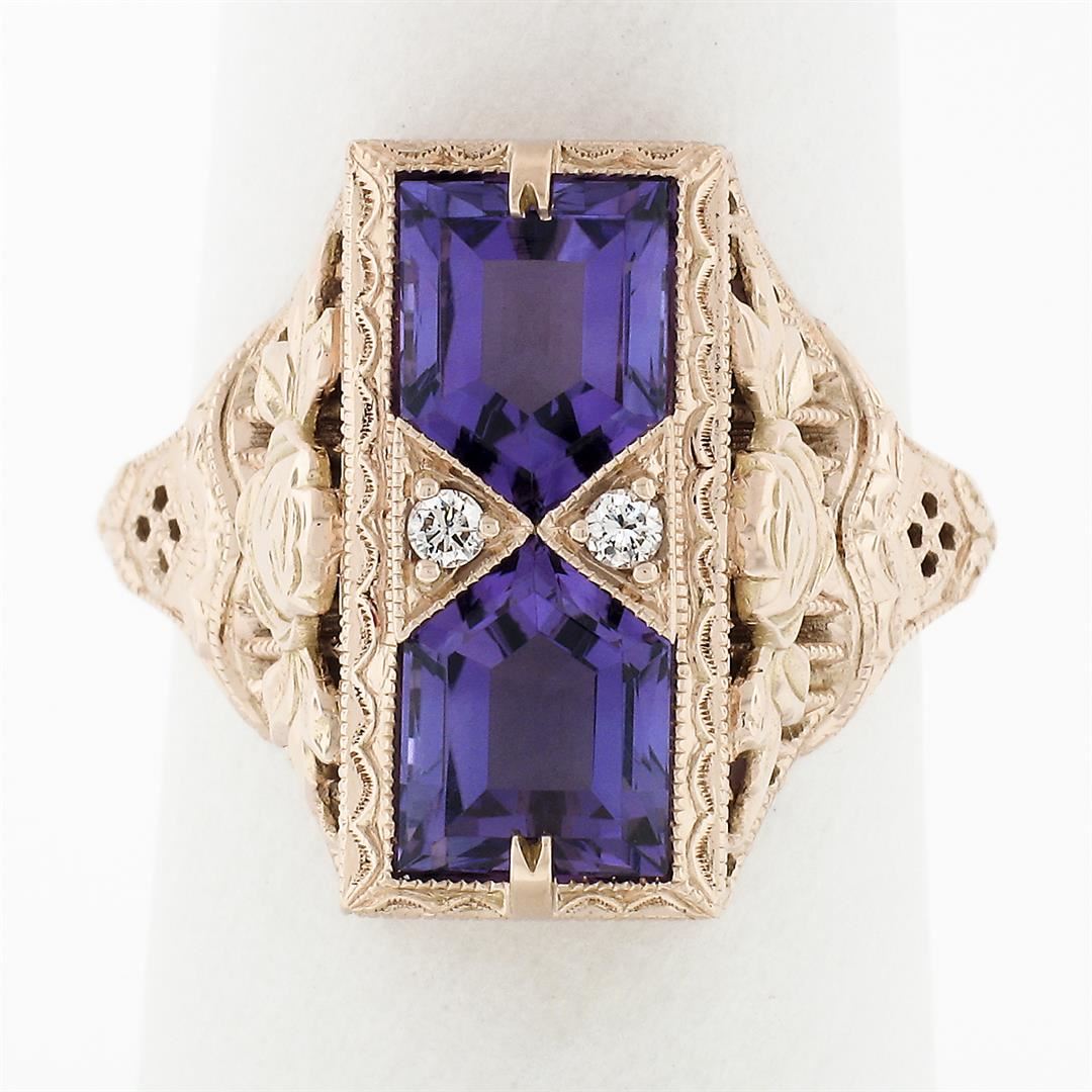 A new solid 14k rose gold platter ring, with 2 custom cut natural amethysts (1.76ctw), & 2 round brilliant cut natural diamonds (G- VS2 ; 0.04ctw). The ring is size 6.5, weighs a total of 6.25 grams, and measures 17.2mm wide.